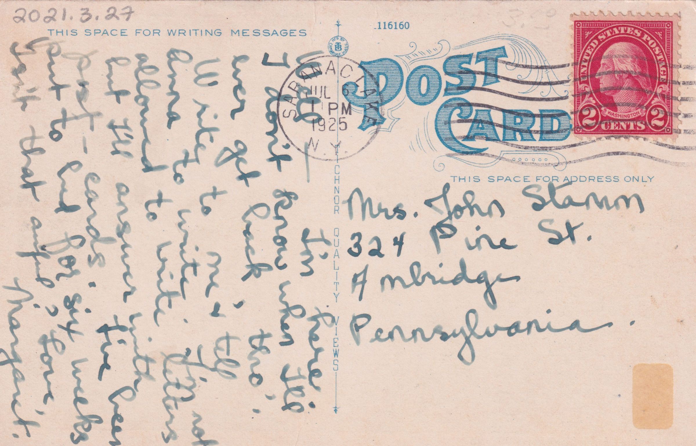 Color postcard of the village of Saranac Lake from Blood/Lake Street Hill showing a portion of Lake Flower. The Riverside Inn, Methodist Church, the Santanoni, and other buildings are visible. Used, divided back, white border, postmarked July 6, 1925, Saranac Lake, NY. Caption printed on front reads, "Bird's-eye View Town and Lake Flower, Looking Northeast, Saranac Lake, N.Y. in the Adirondacks." Handwritten message on back reads, "Well--I'm here. I don't know when I'll ever get back, tho'. Write to me and tell Anna to write. I'm not allowed to write letters but I'll answer with post-cards. I've been put to bed for six weeks. isn't that awful? Love, Margaret." Mailed to Mrs. John Stamm, 324 Pine St., Ambridge, Pennsylvania.Subject Place