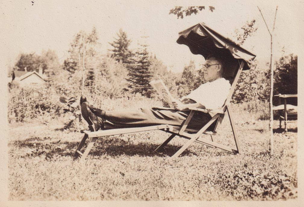 Black-and-White photograph of Edward Jones sitting in a lounge chair outdoors. The chair has an attached awning. Part of album 2024.21.1, kept by Amy Jones and David Blair Jones c. 1930-1934.