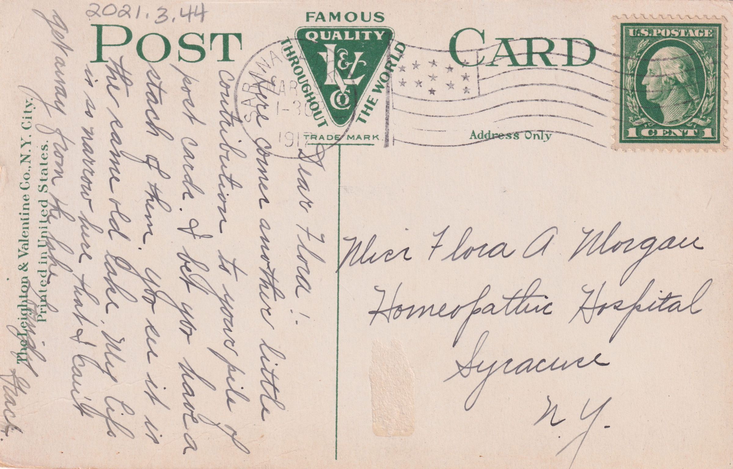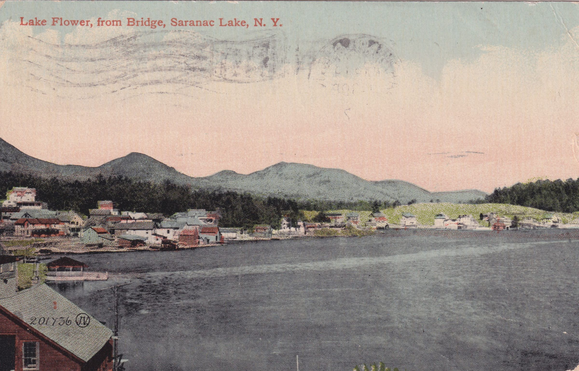 Color postcard looking west across Lake Flower from the Main Street bridge. Houses, businesses, and boathouses are visible along the north shore of the lake, with mountains in the background. The printed caption on the front of the card reads, "Lake Flower, from Bridge, Saranac Lake, N.Y." Used, divided back, postmarked March 19, 1917, Saranac Lake, NY. Printed by the Leighton & Valentine Co., N.Y. City. Handwritten message on back reads, "Dear Flora! Here comes another little contribution to your pile of postcards. I bet you have a stash of them. You see it is the same old lake. My life is so narrow here that I can't get away from the lake. Lovingly, Grace." Mailed to Miss Flora A. Morgan, Homeopathic Hospital, Syracuse, NY.Subject Place