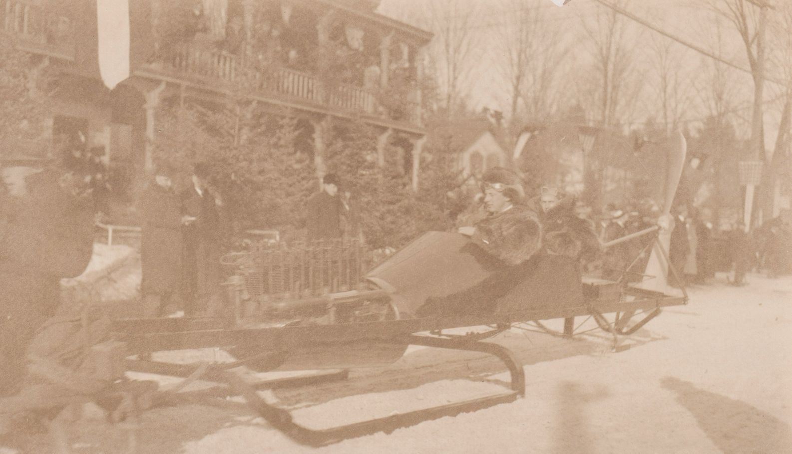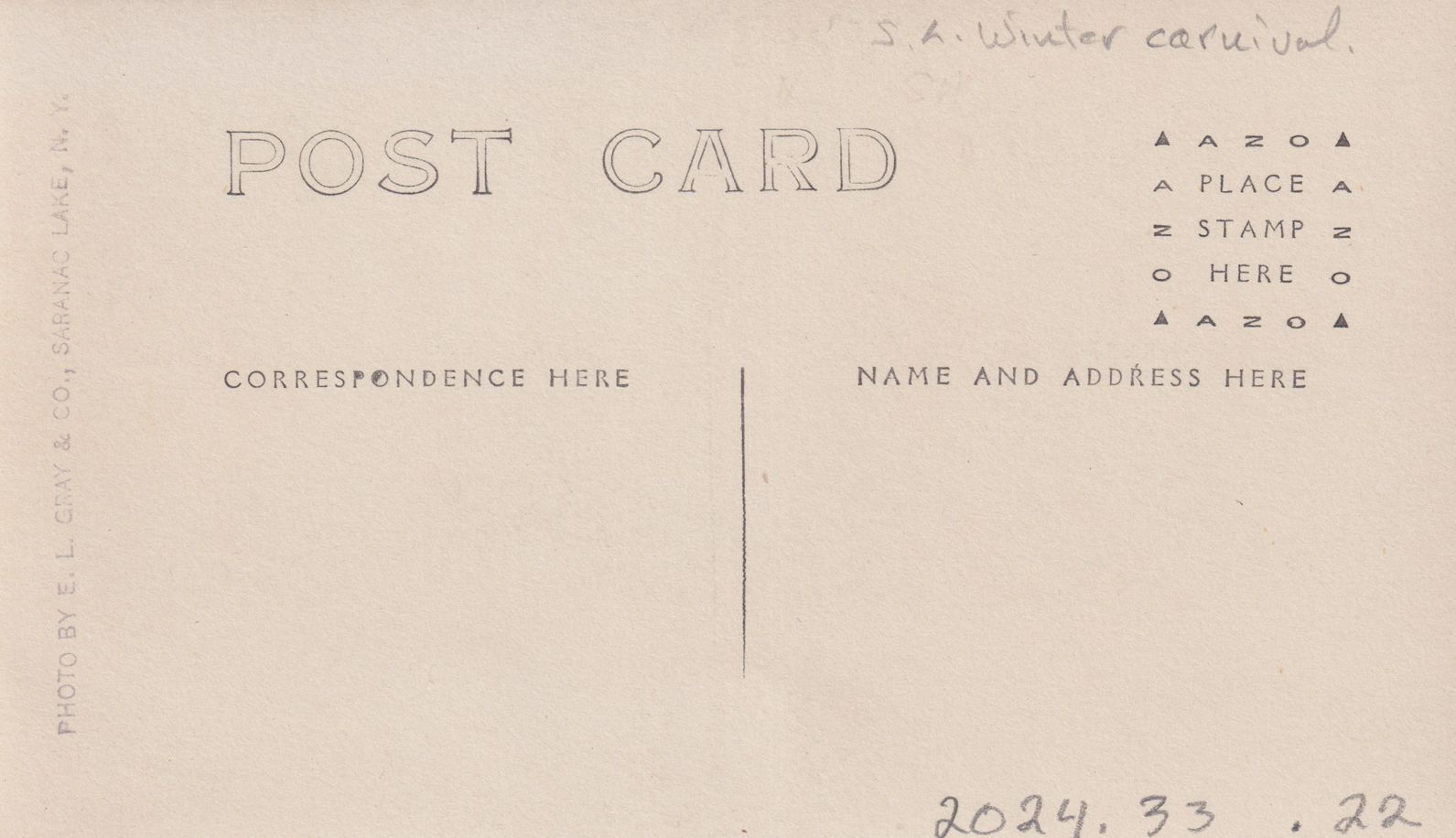 Black and white photo postcard of a two people in a horse-drawn sleigh during Winter Carnival. Photographed by E. L. Gray & Co., Saranac Lake, NY.