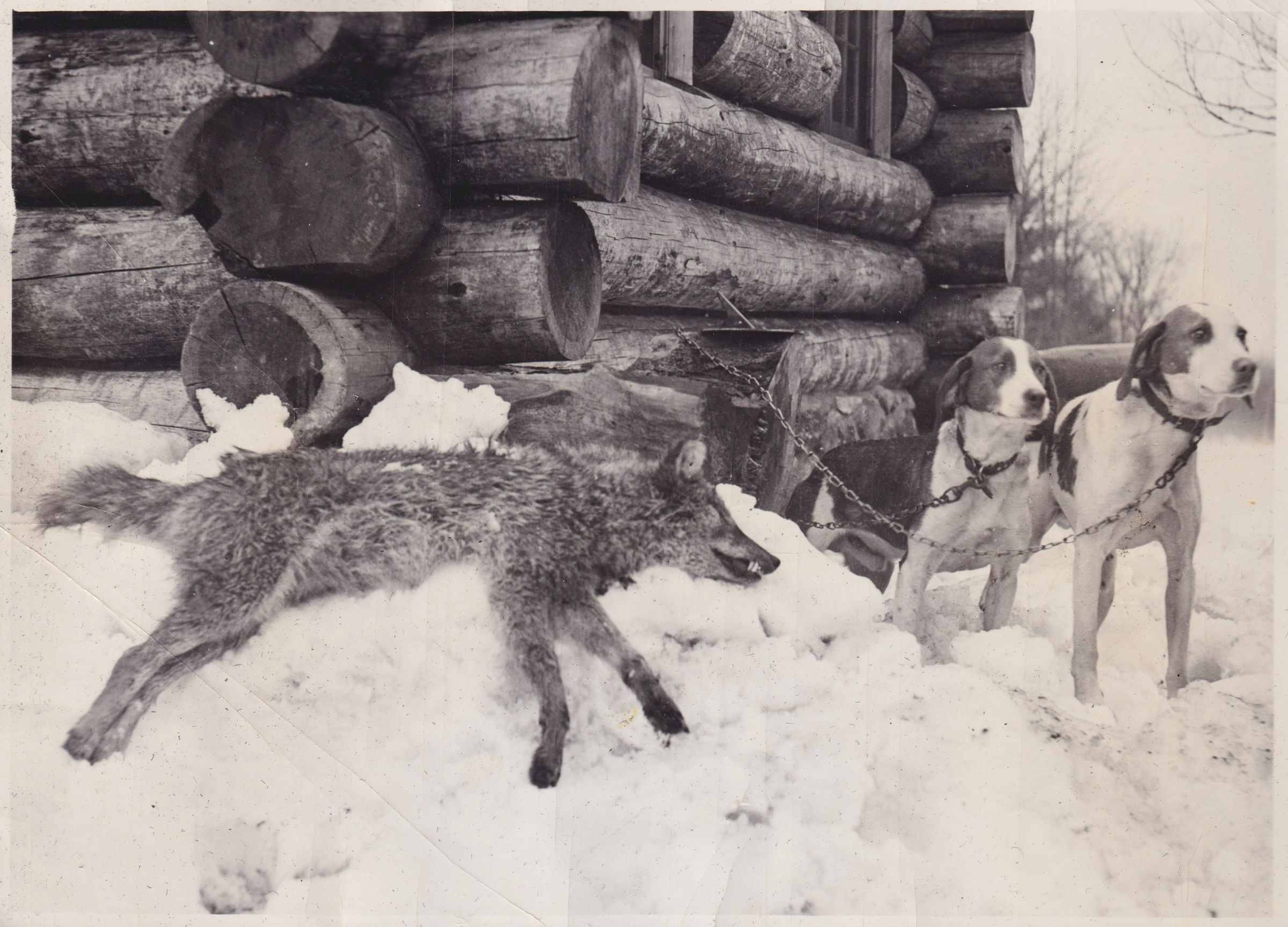 Black-and-White photograph of two hunting dogs in the snow next to a dead coyote. A portion of a log cabin can be seen in the background.