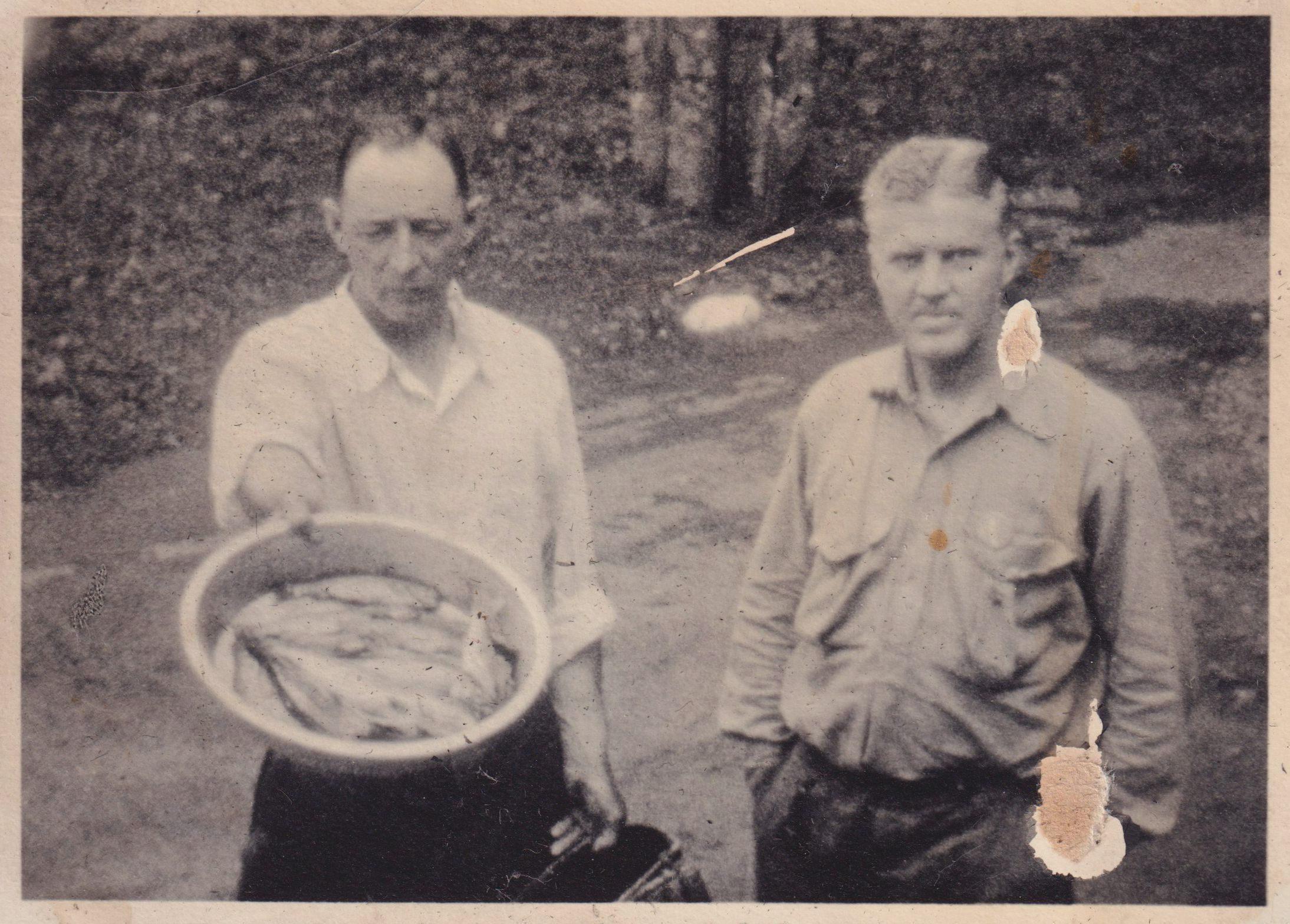 Black-and-White photograph of two unidentified men standing outside. The man at left is holding a pan full of fish out to the camera.