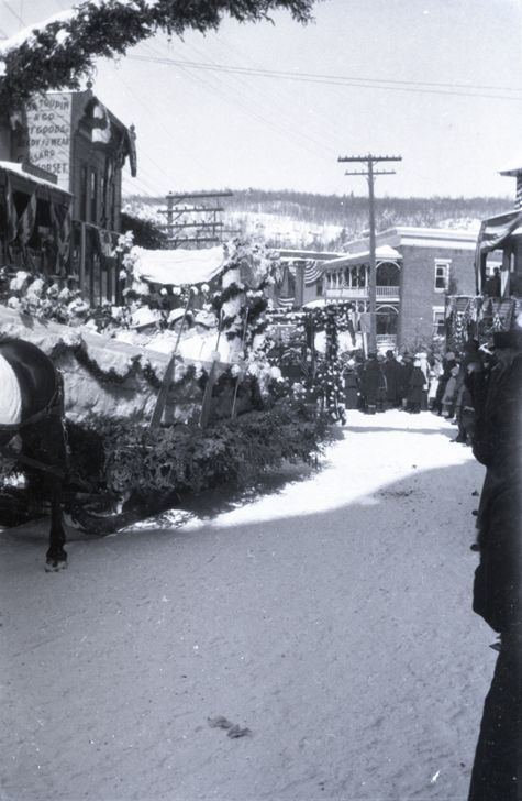Negative of a winter carnival float shaped like a boat with women on it. The float is being pulled by a horse and approaching the intersection of Main Street and Broadway. Most likely taken by Mary Ives Baldwin. This item is not fully cataloged but has been uploaded so the image is publicly available; if you would like us to prioritize cataloging this item, please contact the HSL Collections team.