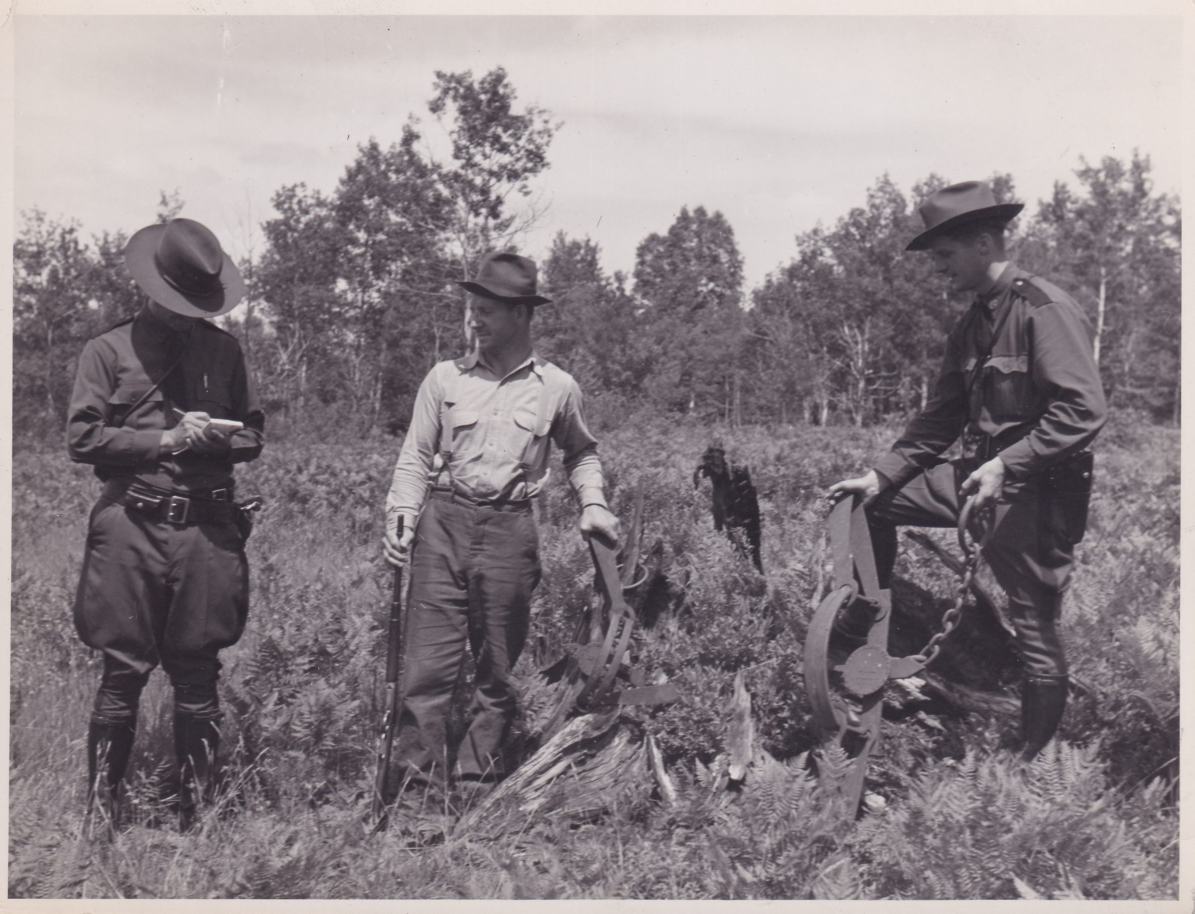 Black-and-White photograph of two men in game warden uniforms standing with a man with a hunting rifle. The man and one of the wardens are holding animal traps. The other warden appears to be writing notes or a ticket.