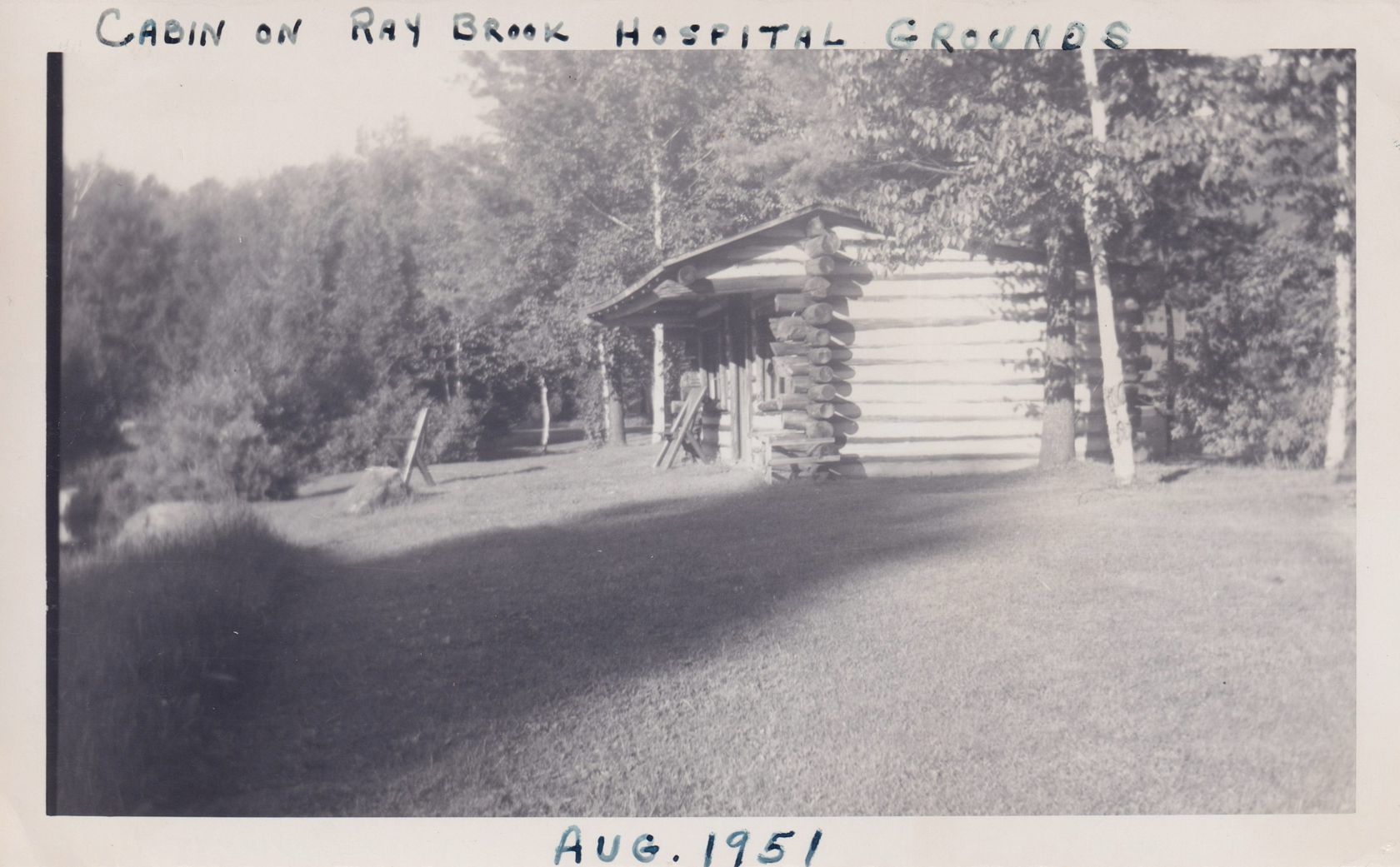 Black-and-White photograph of a log cabin. Handwritten caption on front reads, "Cabin on Ray Brook Hospital Grounds, Aug. 1951." Print has decorative scalloped edges.