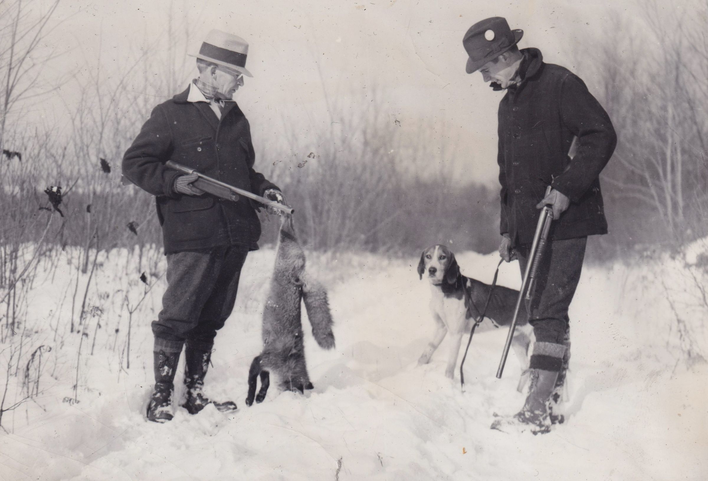 Black-and-White photograph of two men standing in the snow with a hunting dog. Both men are holding rifles, and the man at left is holding a dead fox by its hind feet.