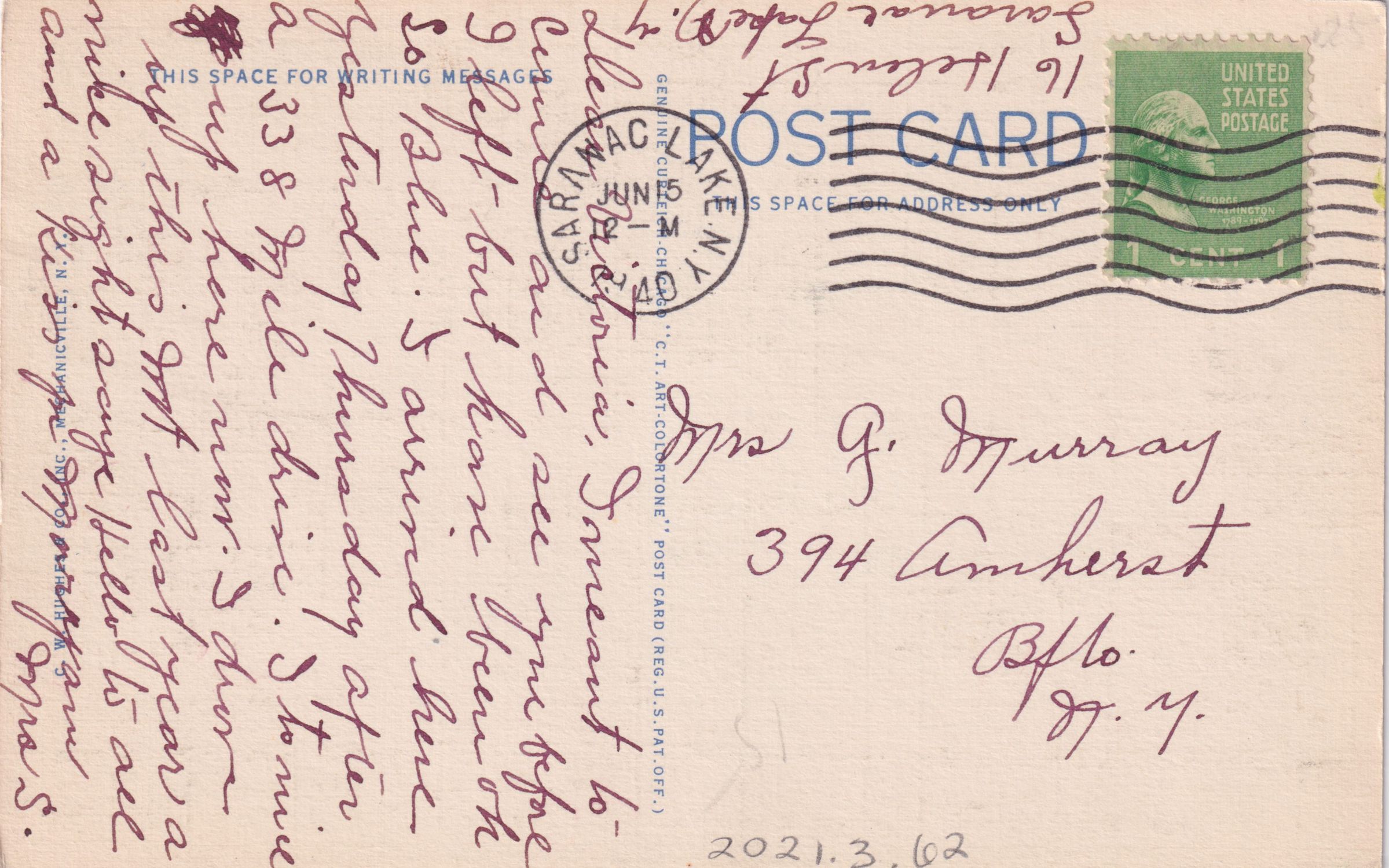 Color postcard showing an image of the highway and observation deck on Whiteface Mountain. Printed caption on the front reads, "Whiteface Mountain Memorial Highway, Showing Castle, 151 LP. Summit House and Winding Trail, Adirondack Mountains, N. Y." The elevator entrance is indicated with an arrow as well. Photo by Fairchild Aerial Surveys, Inc., N.Y.C. Used, divided back, postmarked June 15, 1940, Saranac Lake, NY. Printed by C. W. Hughes & Co., Inc., Mechanicville, NY. Handwritten message on the back reads, "Dear Victoria, I meant to come and see you before I left but have been oh so blue. I arrived here yesterday, Thursday after a 338 mile drive. Its nice up here now. I drove up this mountain last year a nice sight. Say hello to all and a kiss to Maryann. Mrs. S. 16 Helen St, Saranac Lake, NY." Mailed to Mrs. G. Murray, 394 Amherst, Bflo, N.Y.Subject Place