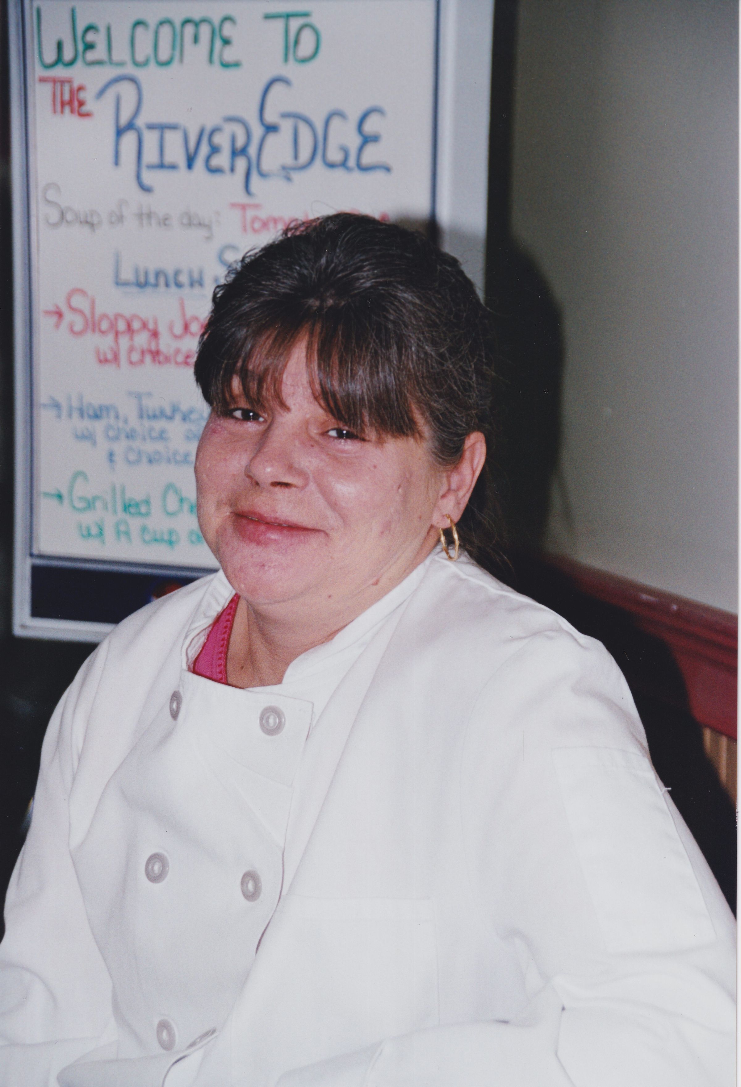 Color photograph of Joanne Johnson standing in front of a white board inside of her business, River Edge Restaurant. Portrait taken by Mary Lou Hanpeter Banks as part of her Soul Proprietor exhibition.