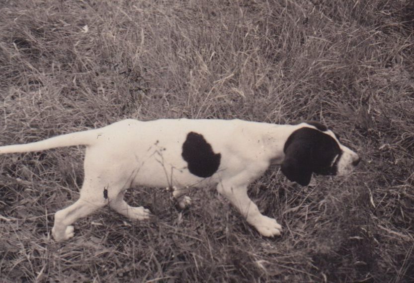 Black-and-White photograph of a hunting dog standing in the grass. Printed from a contact sheet.