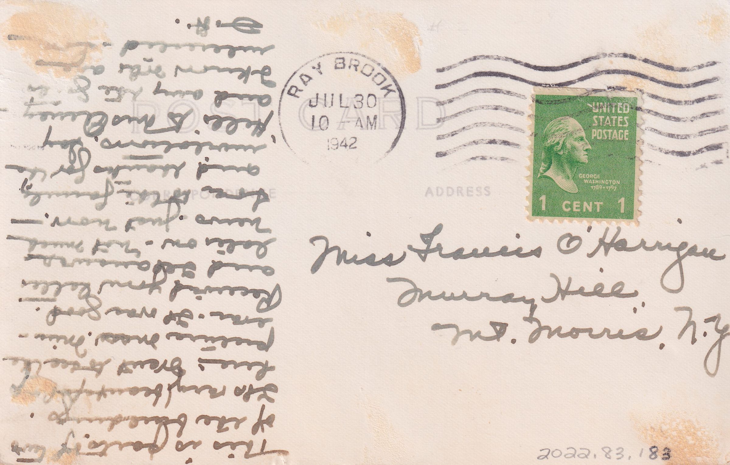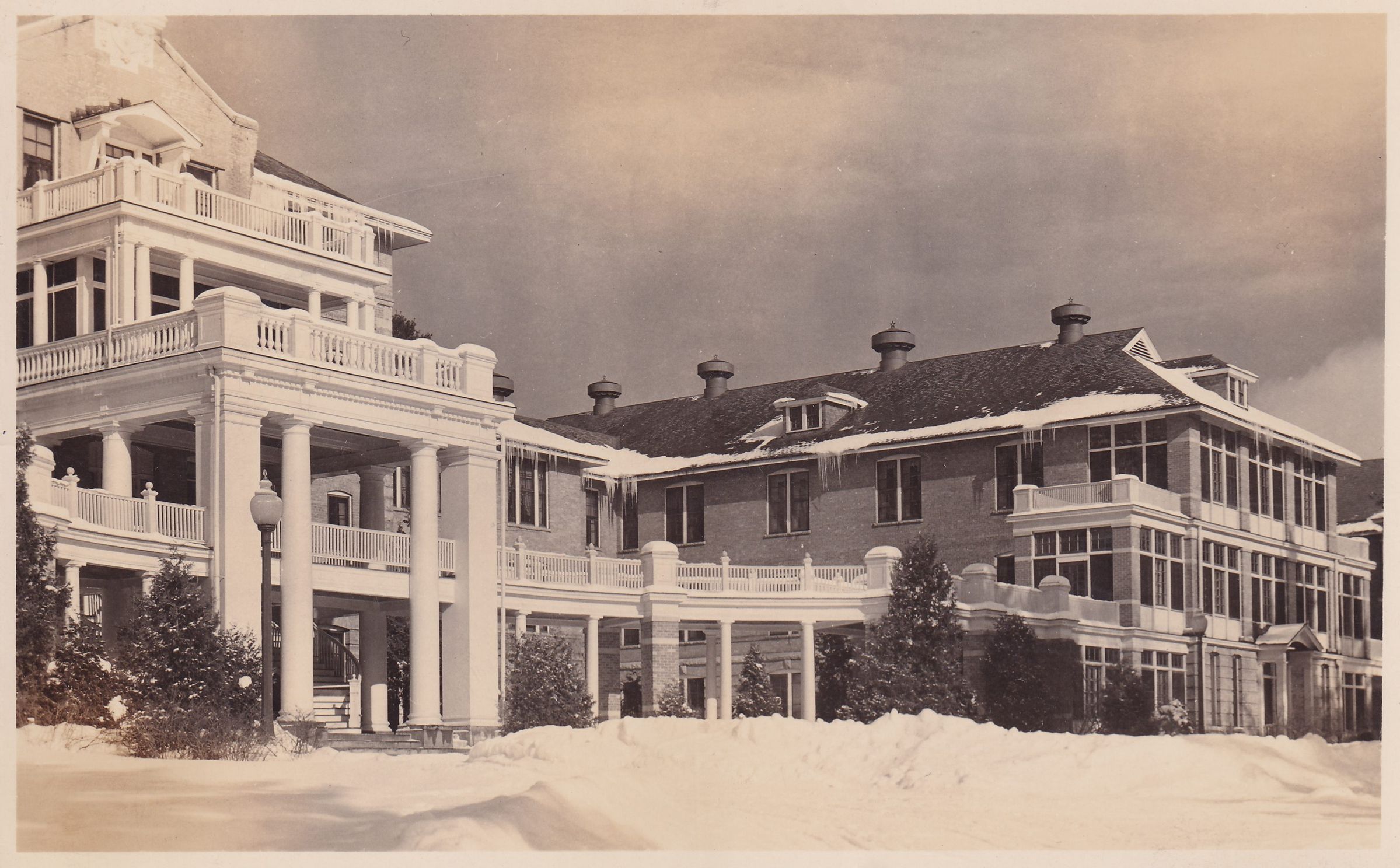 Photograph postcard showing the Main Building at the New York State Sanatorium for Incipient Tuberculosis, AKA Ray Brook Sanatorium, in the snow. Used, white border, postmarked Ray Brook, NY, July 30, 192. Handwritten message on back reads, "This is parts of two of the buildings. It’s real beautiful up here. Went to see the picture Mrs. Miniver. It was good. Received your letter and I'll answer later on. Not much news. Just work. Love to the family and thanks for the invitations. Say ‘Hello’ to Mrs. [?] and all the girls. I know we are [?]. Love D.H." Mailed to Miss Francis O’Harrigan, Murray Hill, Mt. Morris, NY.Subject Place