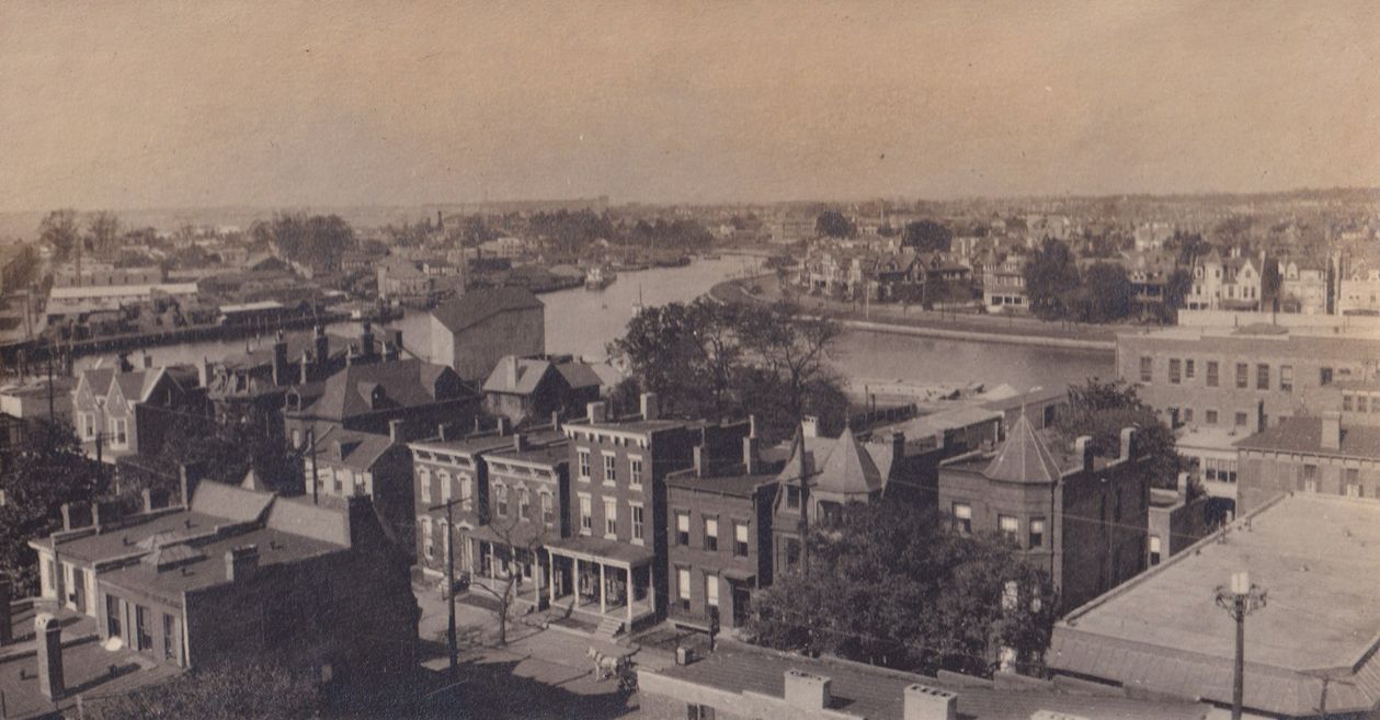 Black-and-white photograph of a city street with a river behind it. There are many buildings running along the street, and similar streets on the other side of the river as well.