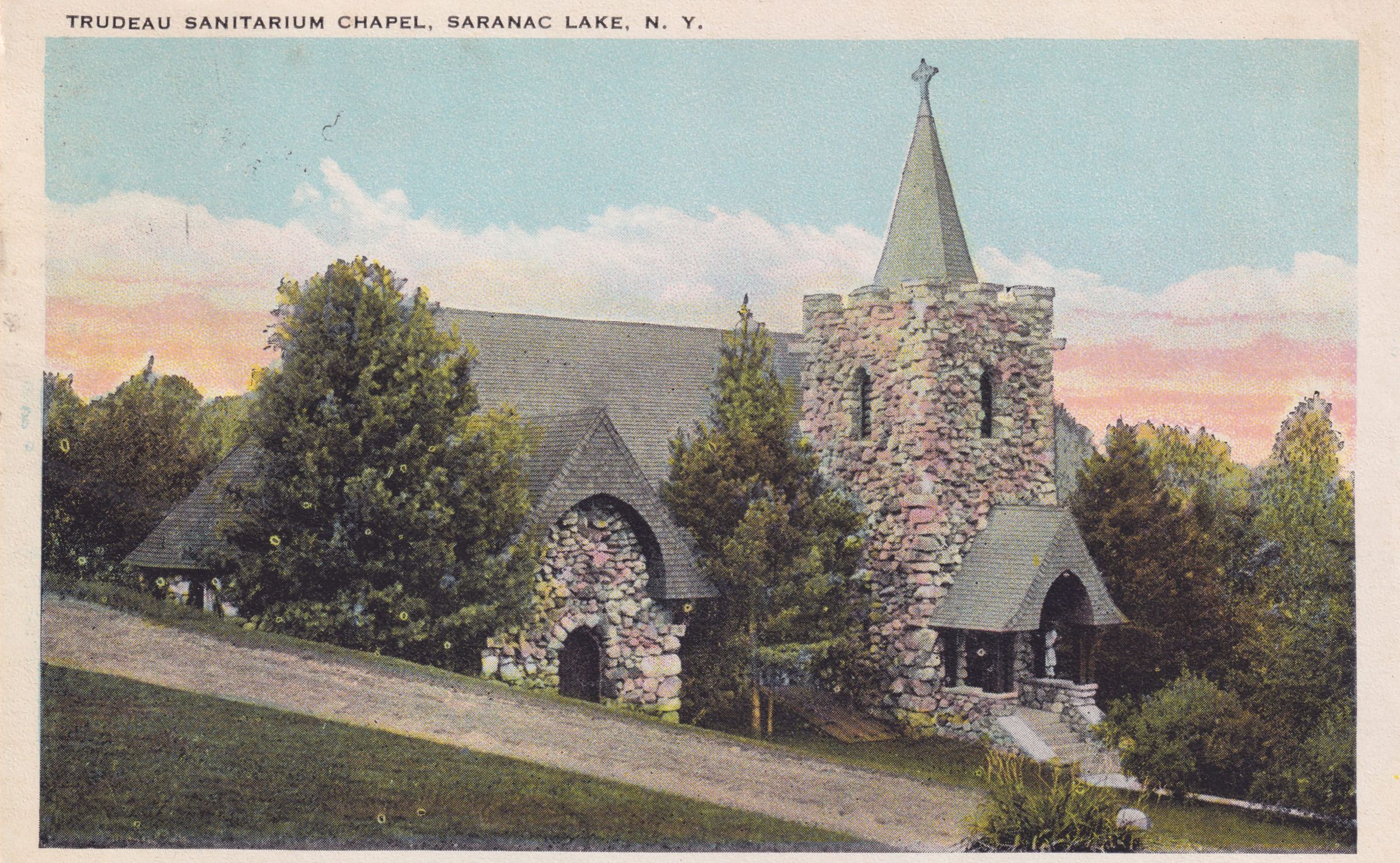 Color postcard showing the stone chapel, Baker Chapel, at Trudeau Sanatorium. Printed caption on the front reads, "Trudeau Sanitarium [sic] Chapel. Saranac Lake, N. Y." Used, divided back, postmarked April 13, 1925. Printed in Cambridge, Mass. Handwritten message on the back reads, "Dear Warren - I am so pleased you had such a lovely confirmation bet you looked spiffy. What are you going to do with your bank account? Thank you for the program - nice of you to mail it. Thank everyone for the Easter cards. Has Norbert returned to school? Was the bunny good? I'll bet Cornie's card is dandy. Are you going to learn to drive? Love Aunt Ida." Mailed to Mr. Warren Meyer, 602 Northampton St., Buffalo, NY.Subject Place