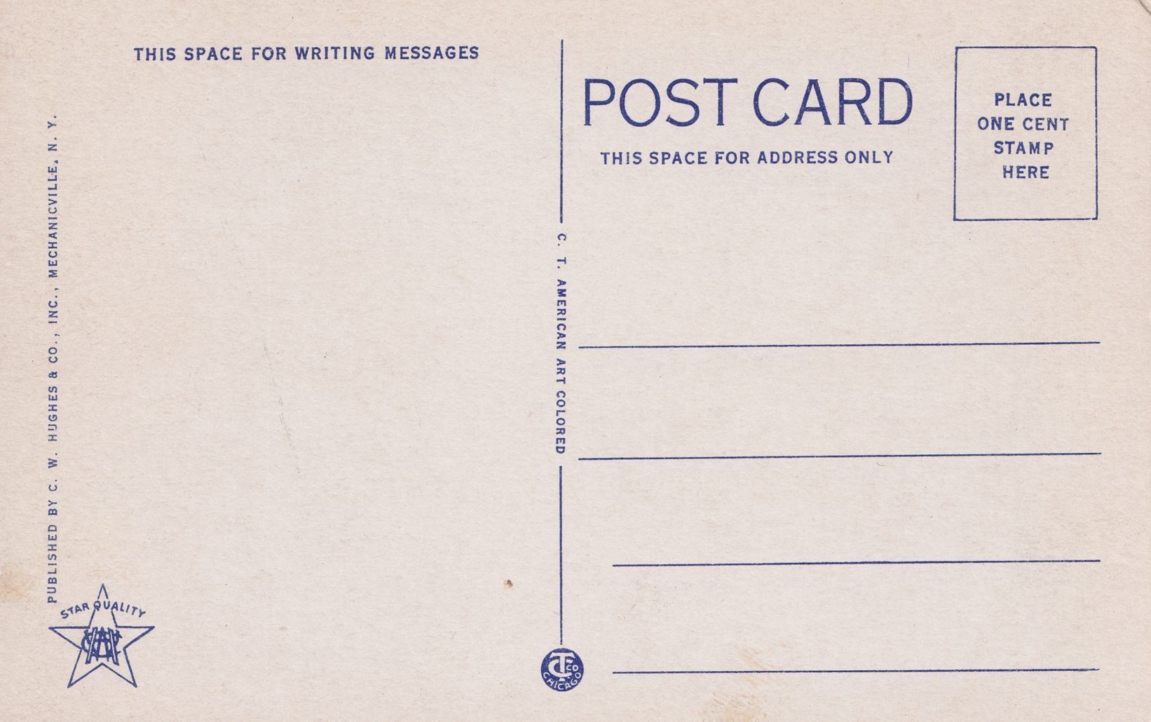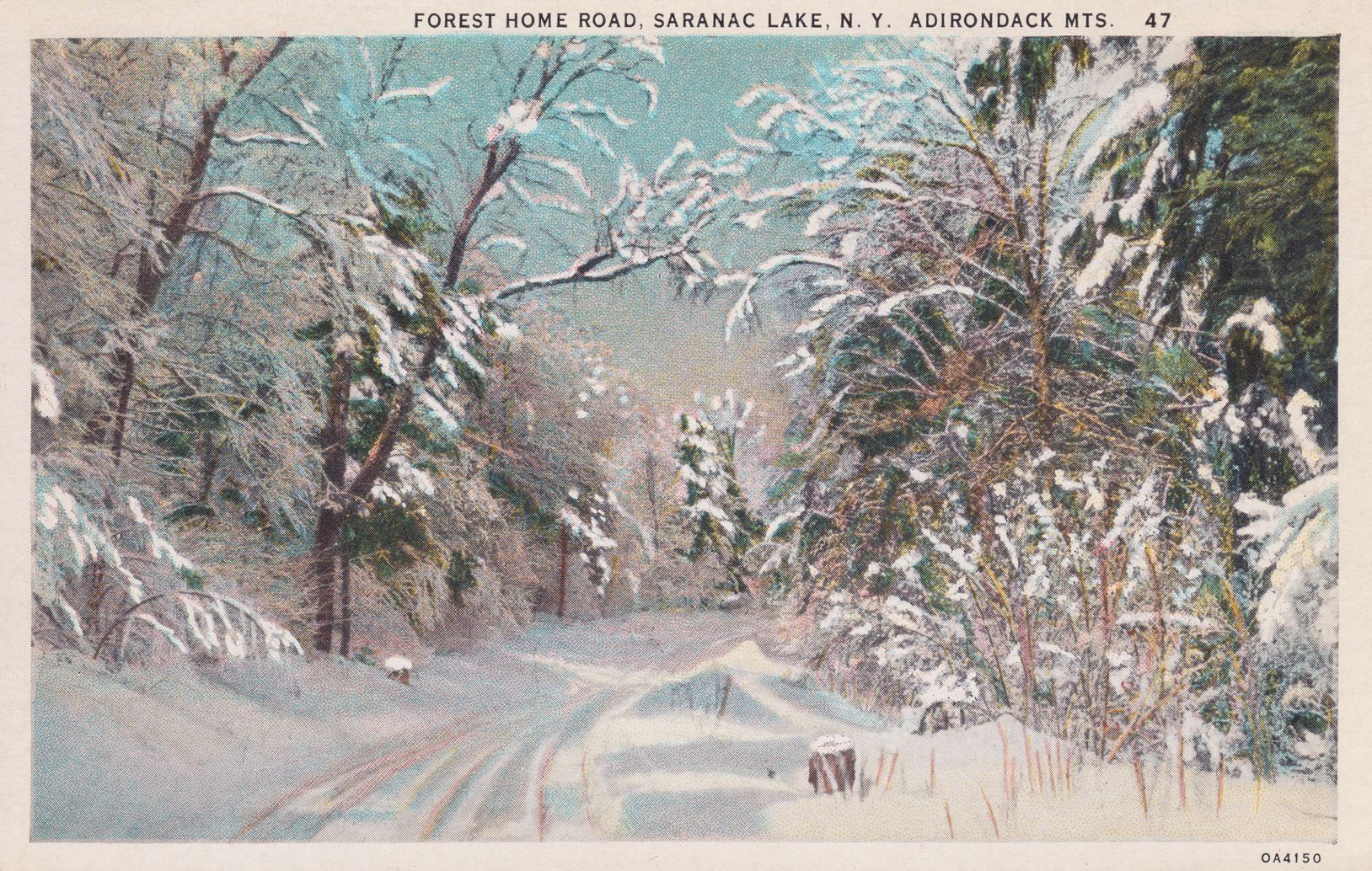 Postcard with an image of a snow-covered bend in Forest Home Road. The reverse of the postcard has the publication information, "Published by C. W. Hughes & Co., Inc., Mechanicville, N.Y."