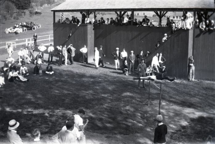 Negative of a group of spectators watching an unidentified young man do a high jump. Most likely taken by Henry Ives Baldwin. This item is not fully cataloged but has been uploaded so the image is publicly available; if you would like us to prioritize cataloging this item, please contact the HSL Collections team.