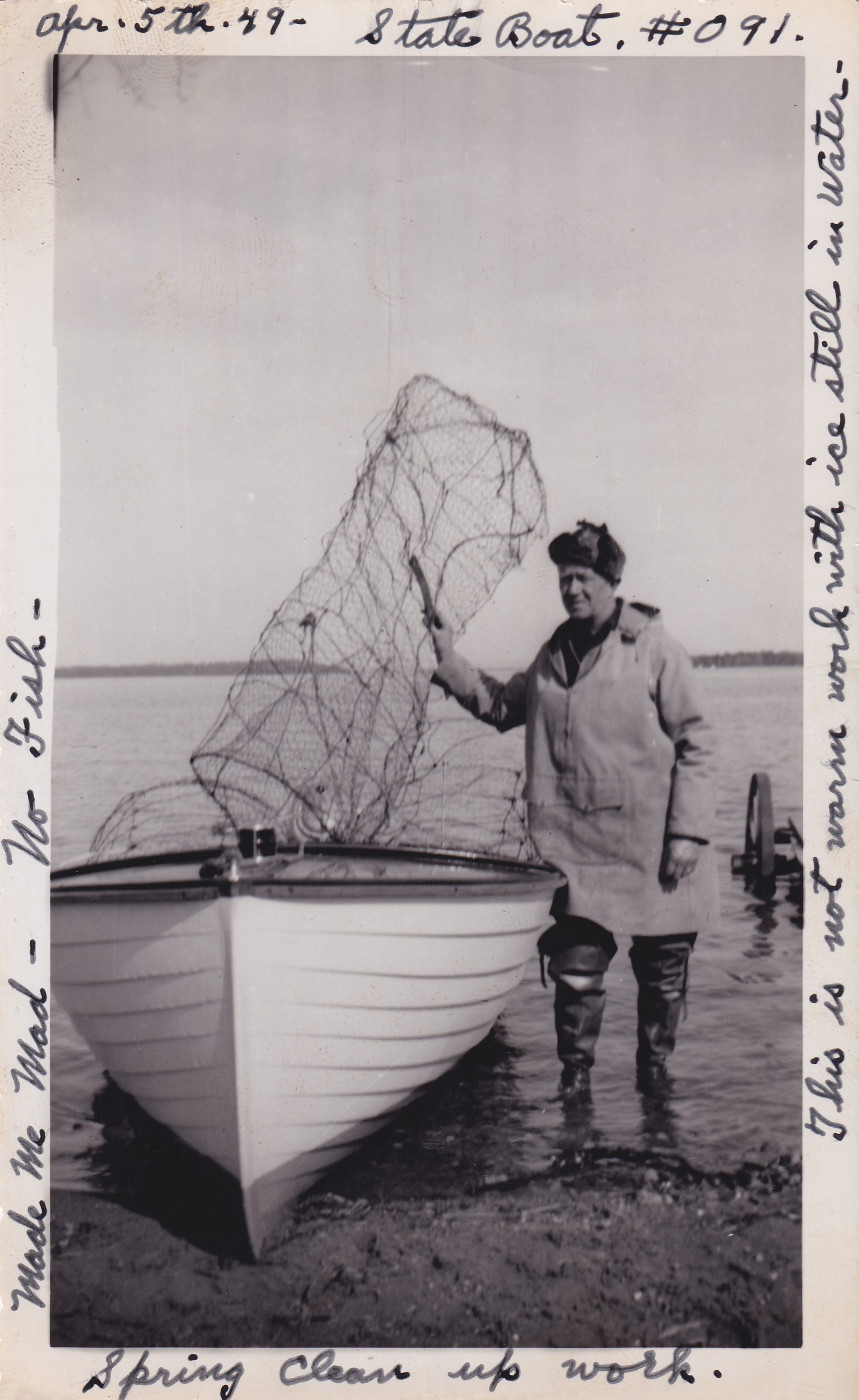 Black-and-White photograph of a man standing on the shore of Lake Champlain next to a boat. he is holding a fishing trap. Handwritten caption on front reads, "Spring clean up work. Made me mad. No fish. This is not warm work with ice still in water. Apr. 5, 49 - State boat #091."