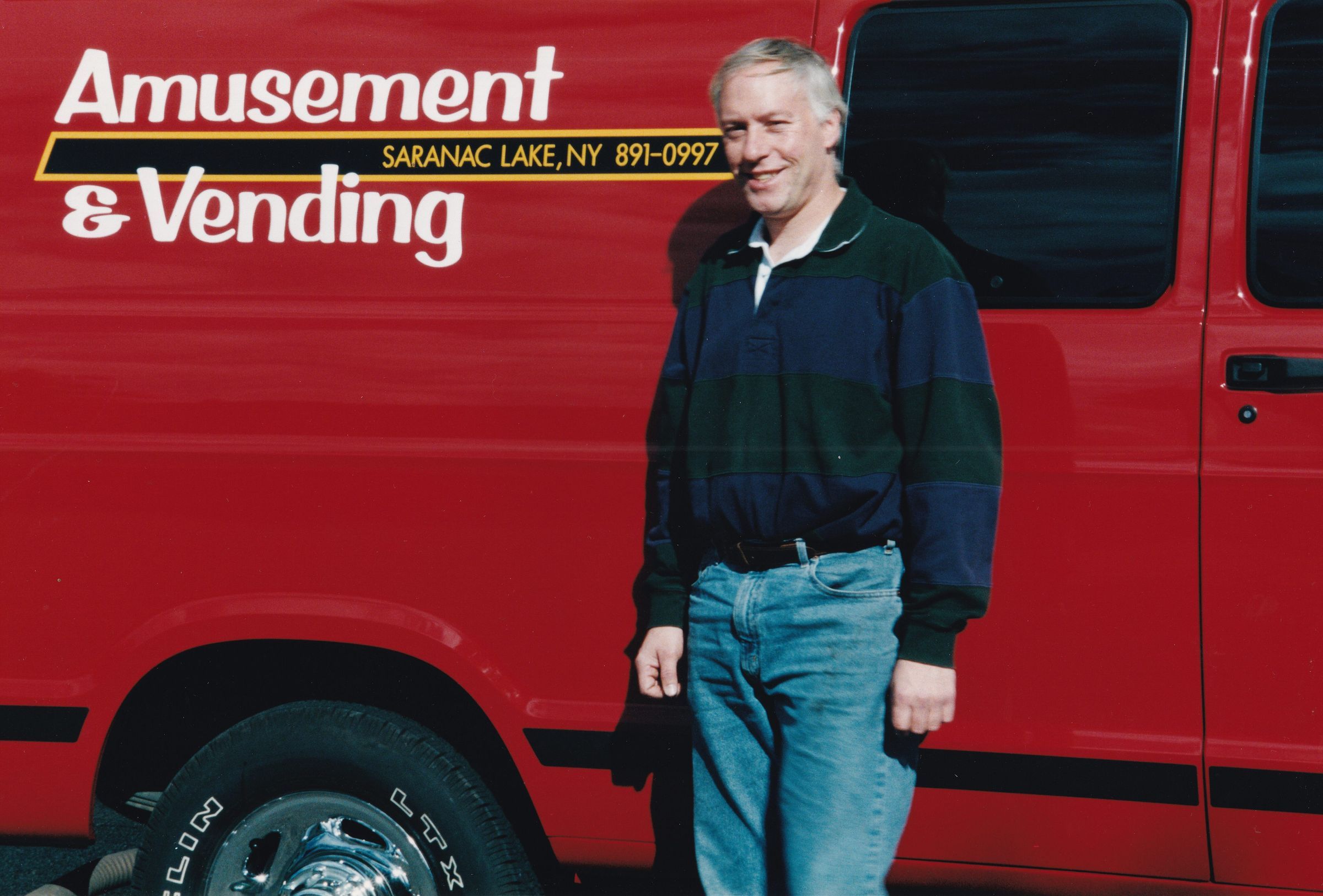 Color photograph of Mike Kinville in front of a truck bearing the name of his business, Amusement & Vending. Portrait taken by Mary Lou Hanpeter Banks as part of her Soul Proprietor exhibition.