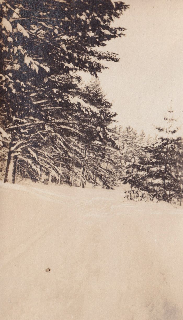 Black-and-white photograph of a snow-covered path running through a wooded area with pine trees. There are ski tracks and footsteps through the snow.