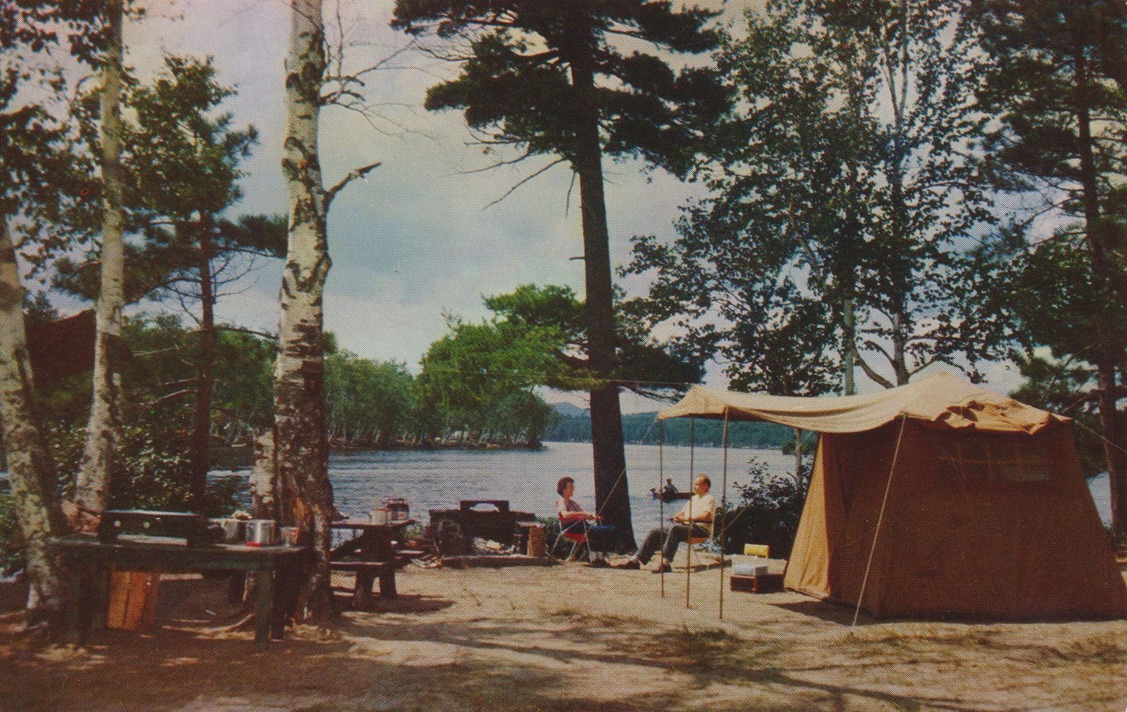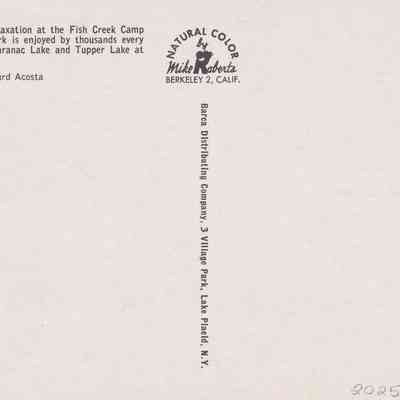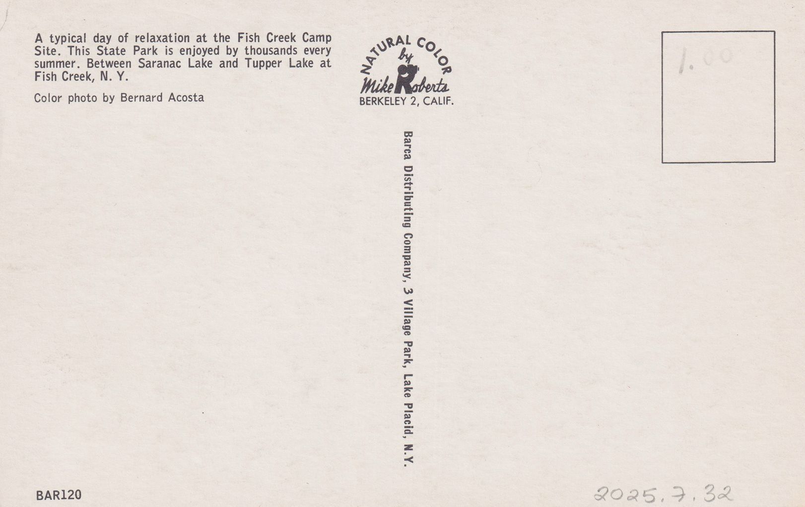 Color postcard showing people at a campsite. Printed caption on reverse reads, "A Typical Day of Relaxation at the Fish Creek Camp Site." Printed by Barca Distributing, Lake Placid, NY. Photograph by Bernard Acosta. Unused, divided back.Subject Place