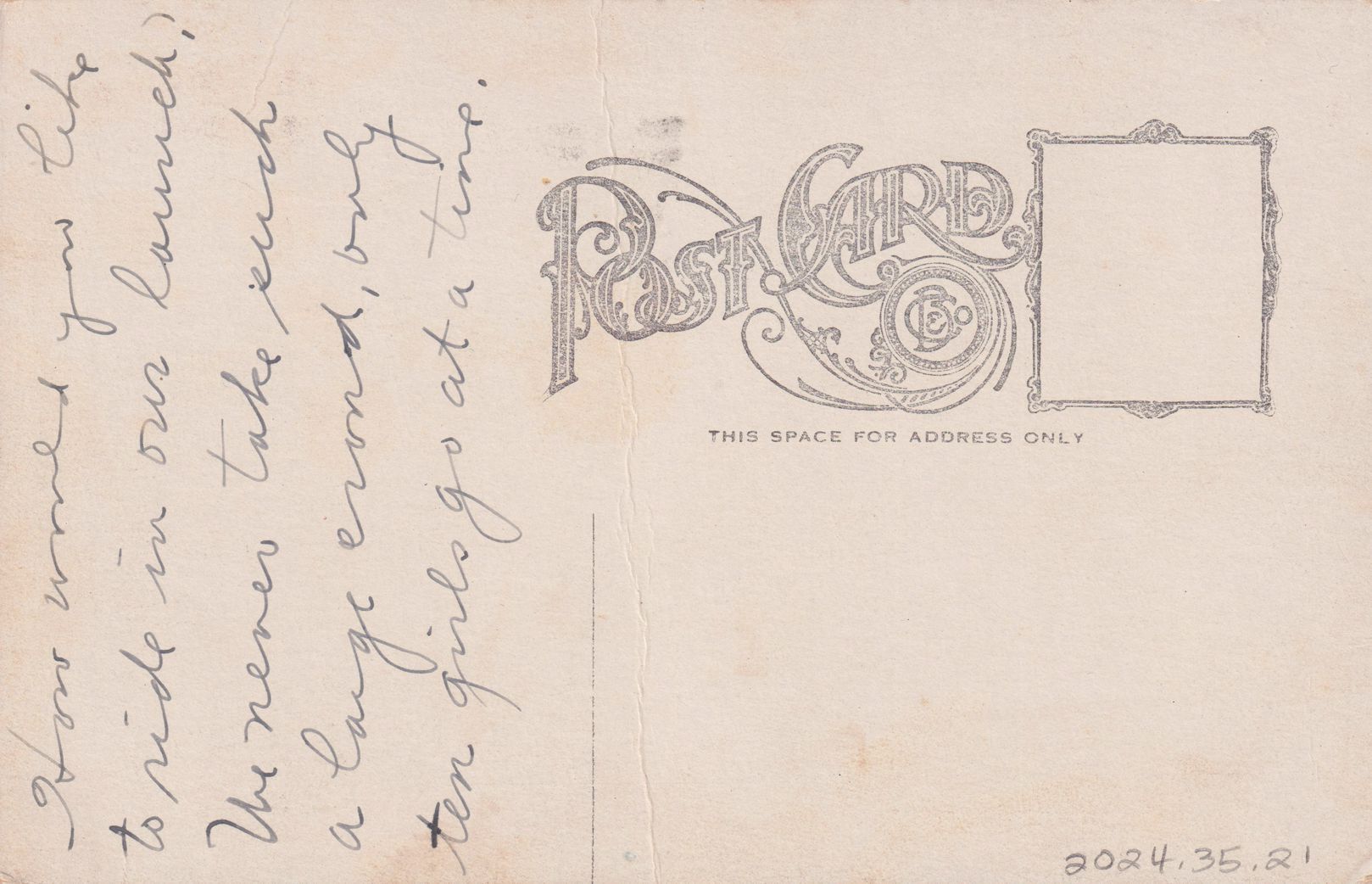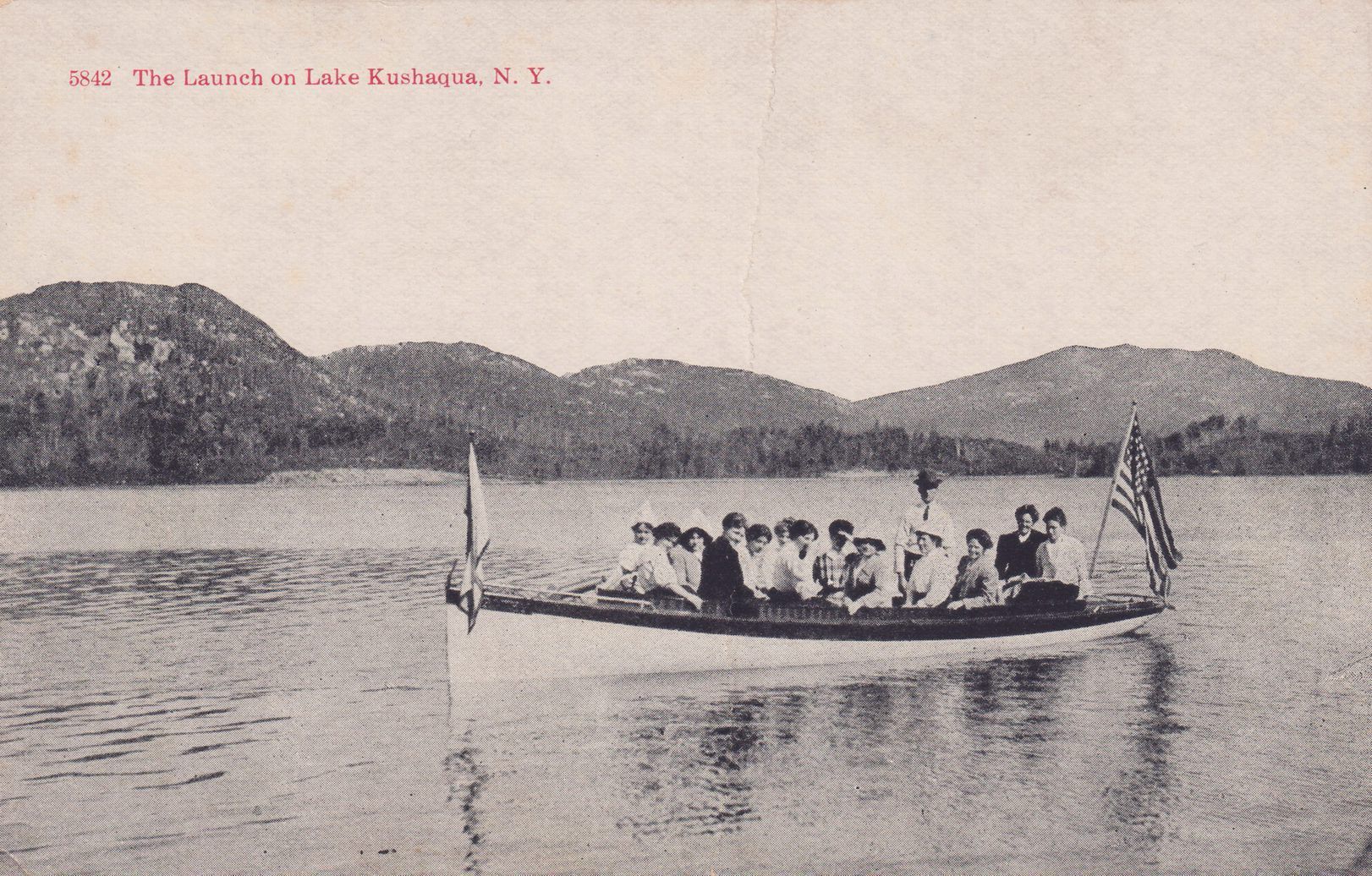 Black-and-White postcard showing a large wooden boat on Lake Kushaqua. More than 10 women are seated on board. Printed caption on front reads, "The Launch on Lake Kushaqua, N. Y." No printer's mark. Used, divided back, not postmarked. Handwritten message on reverse reads, "How would you like to ride in our launch? We never take such a large crowd, only ten girls go at a time."Subject Place