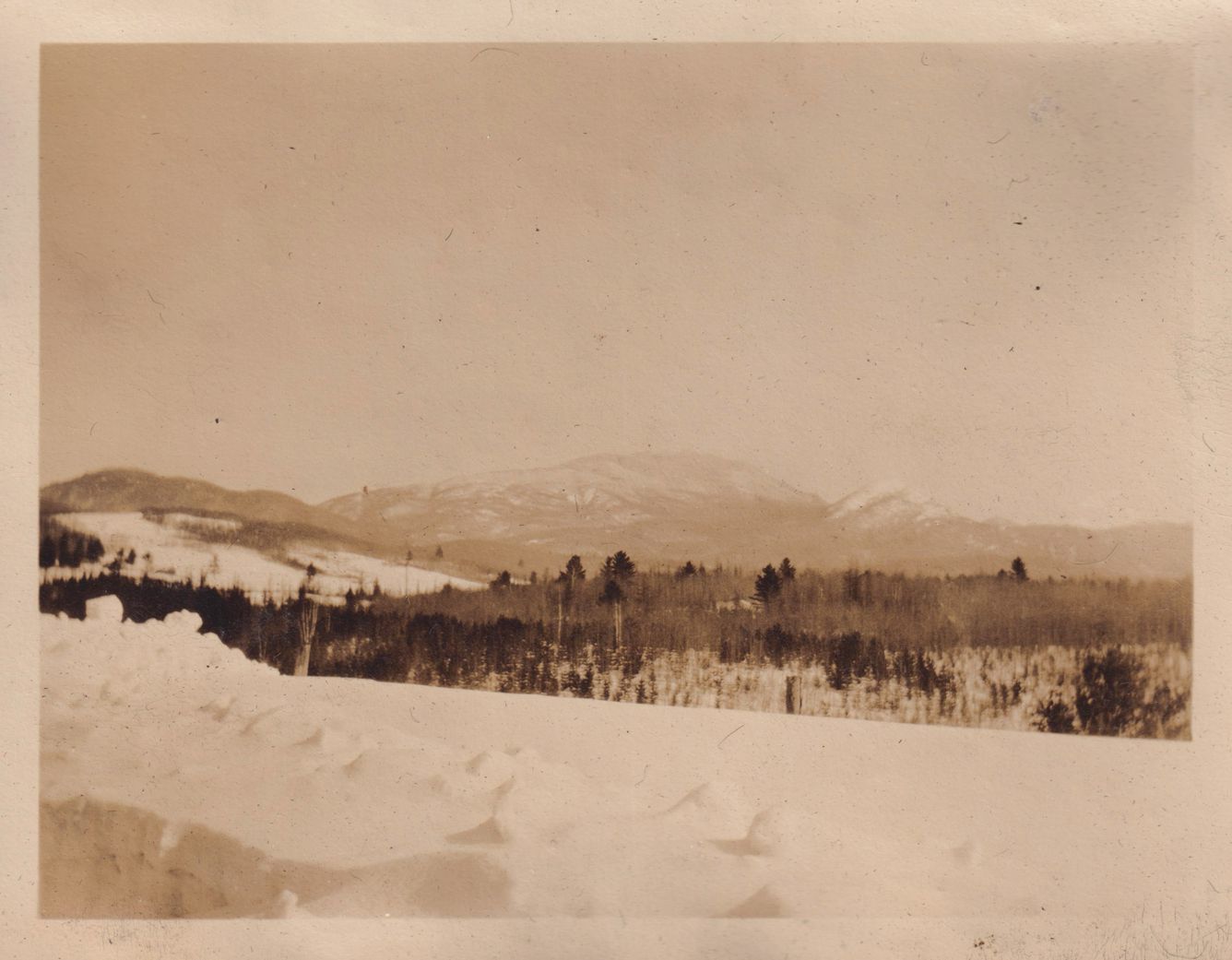 Black-and-White photograph of an unidentified view across the snow toward trees. Mountains are visible in the background.