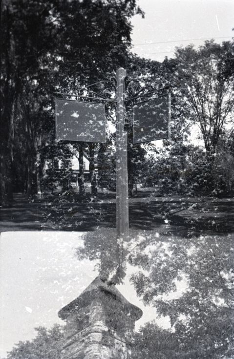 Negative of two images that got processed as one. The top image shows a wooden post holding two signs, perpendicular to each other, in a park or forest. The bottom image shows the top of a stone building. Most likely taken by Mary Ives Baldwin. This item is not fully cataloged but has been uploaded so the image is publicly available; if you would like us to prioritize cataloging this item, please contact the HSL Collections team.