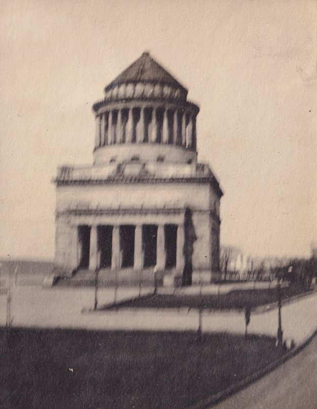 Black-and-white photograph of Ulysses Grant's Tomb in New York City, a stone building with a large rotunda on top of the square-shaped first level. There are columns at the front stairs and lining the rotunda.