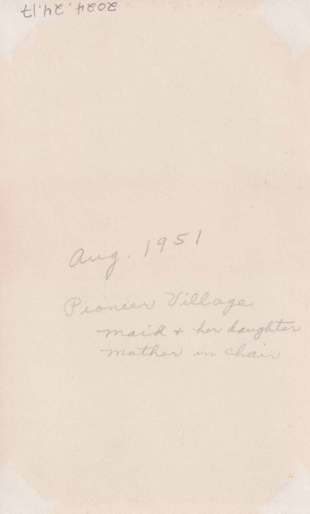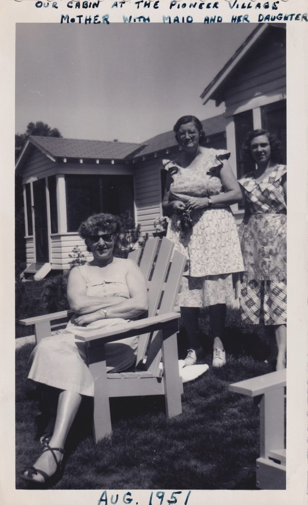 Black-and-White photograph of a group of women in front of two small cabins. One woman is seated in an Adirondack chair, and the other two stand behind her. Handwritten caption on front reads, "Our Cabin at the Pioneer Village - Mother with Maid and her Daughter. Aug. 1951." Print has decorative scalloped edge.