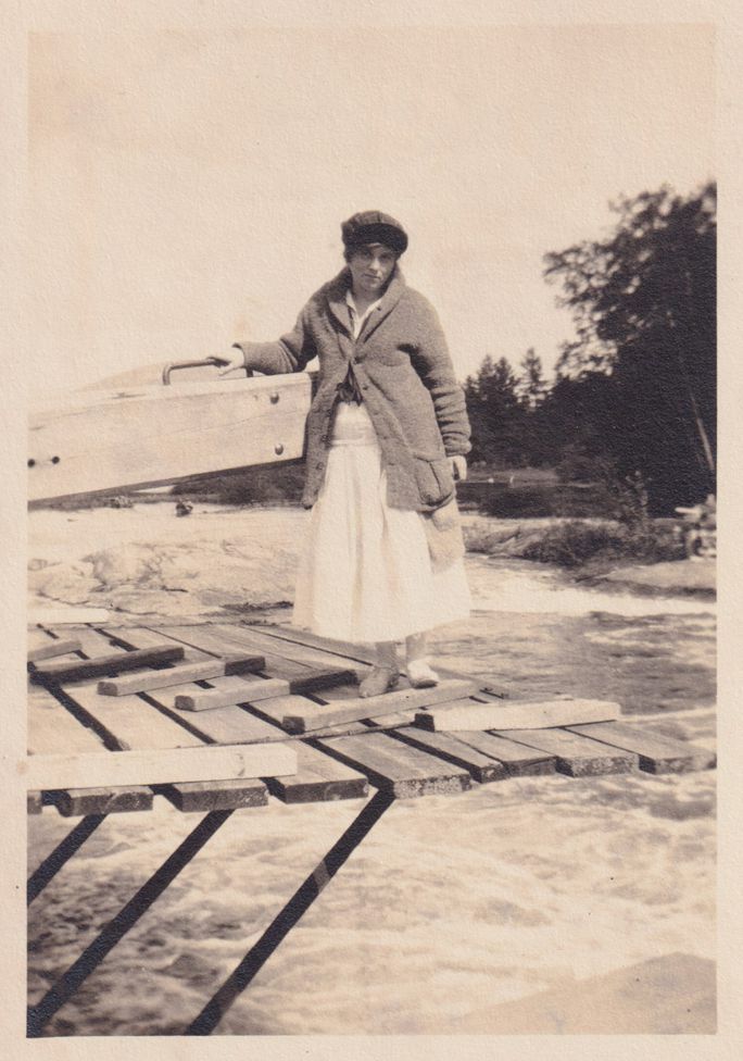 Black-and-White photograph of an unidentified woman standing on a wooden platform over a river. The photograph was likely printed by Kollecker's Kodak and Gift Shop.