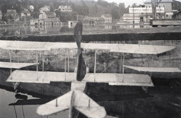 Negative of a model glider resting on top of the surface of a body of water. The shore can be seen in the background, along with a sign for "Thomas Boat Landing." Most likely taken by Mary Ives Baldwin. This item is not fully cataloged but has been uploaded so the image is publicly available; if you would like us to prioritize cataloging this item, please contact the HSL Collections team.