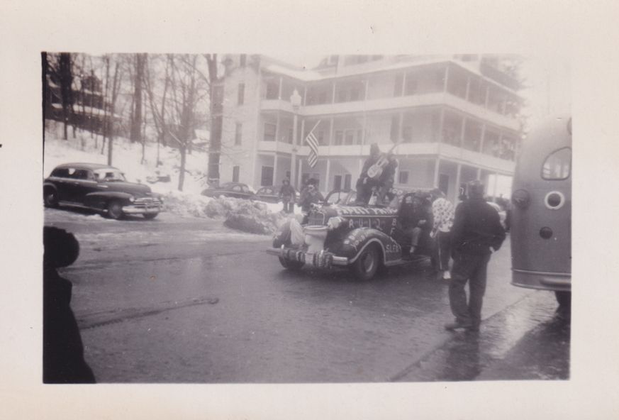 Black and white photograph of a car likely decorated for Winter Carnival. There is a man with a guitar sitting on the hood.