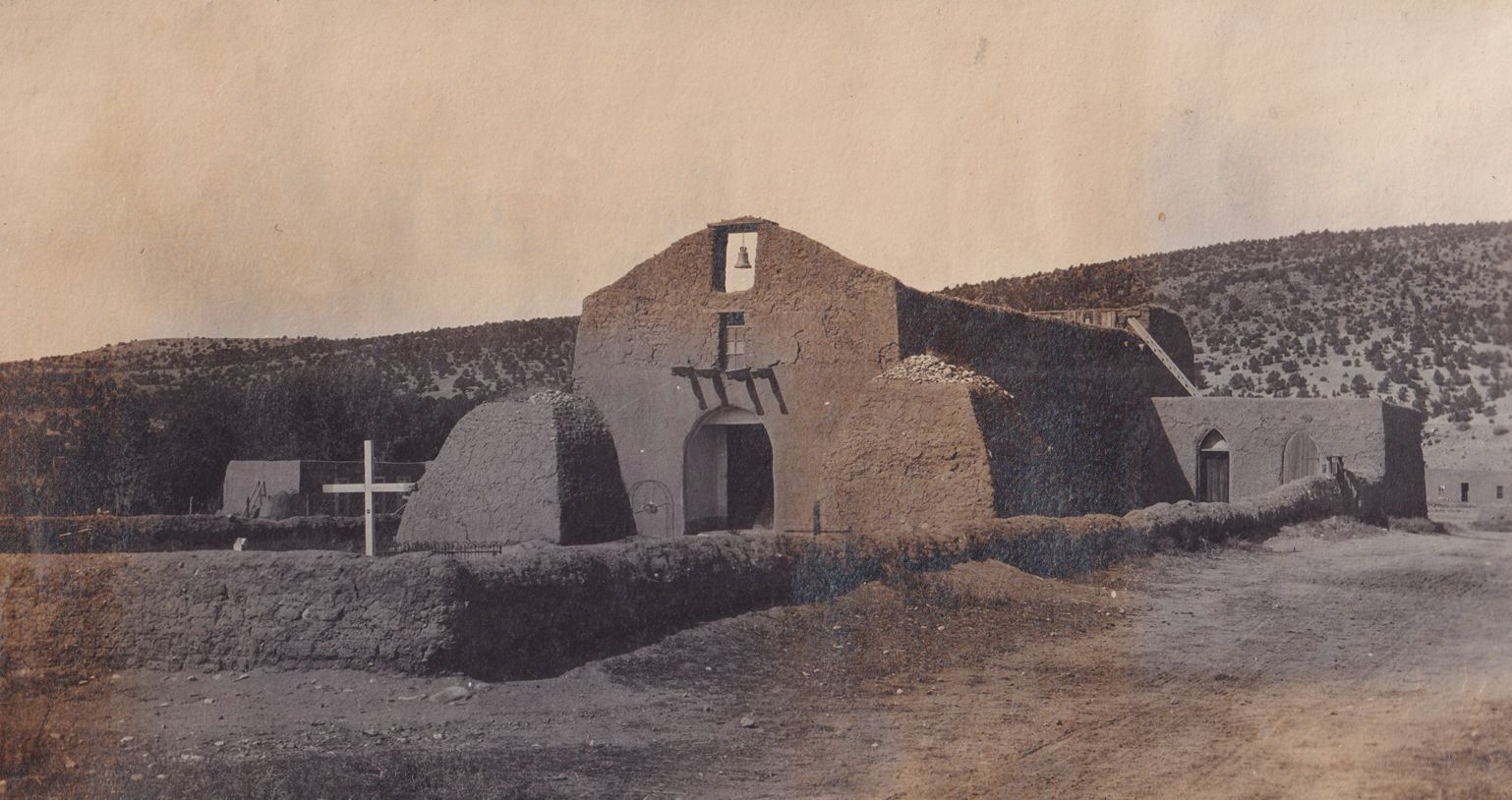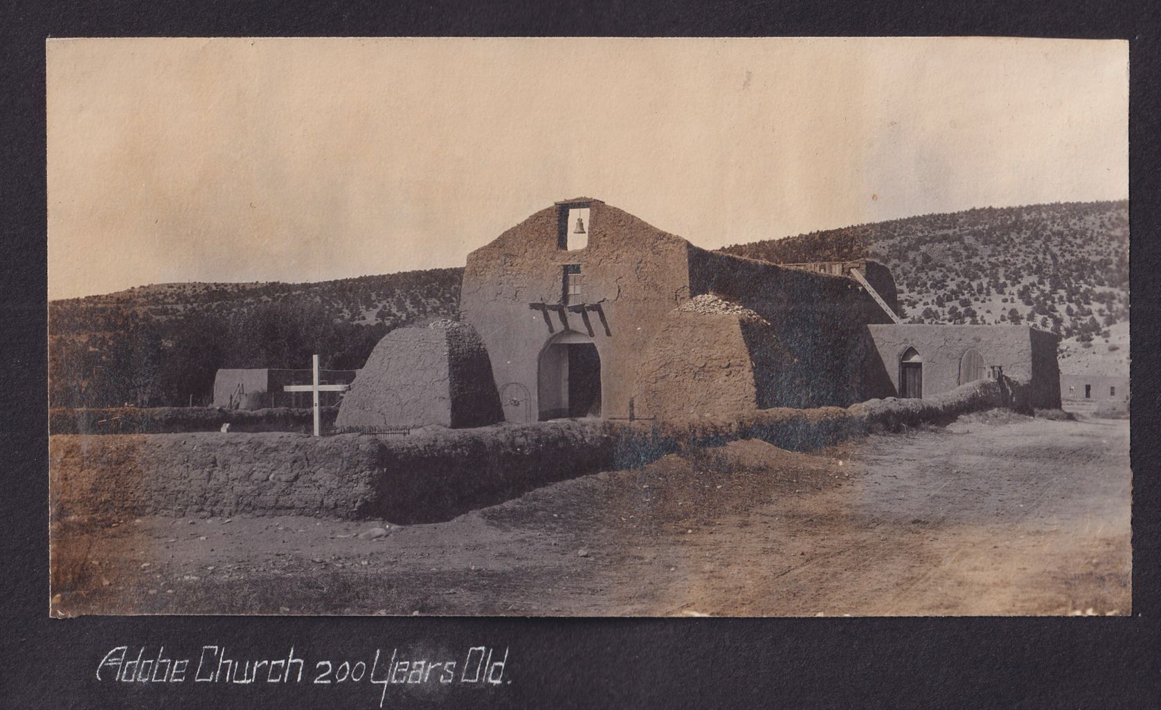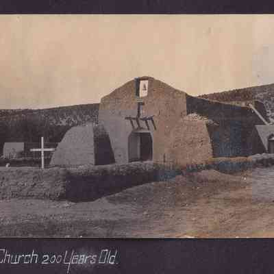 Black-and-white photograph of a rectangular adobe building. There is a cross in the ground before the building. "Adobe Church 200 Years Old." is written in white ink beneath the photo.