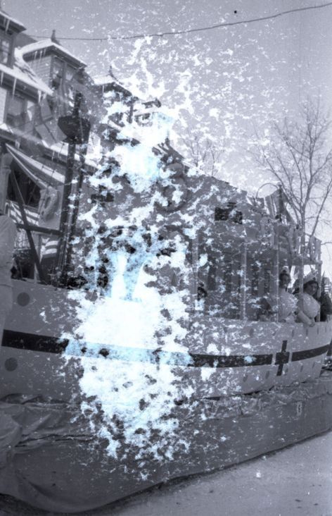 Negative of a Winter Carnival parade float shaped like a boat. There are Red Cross nurses sitting on the float. Most likely taken by Mary Ives Baldwin. This item is not fully cataloged but has been uploaded so the image is publicly available; if you would like us to prioritize cataloging this item, please contact the HSL Collections team.