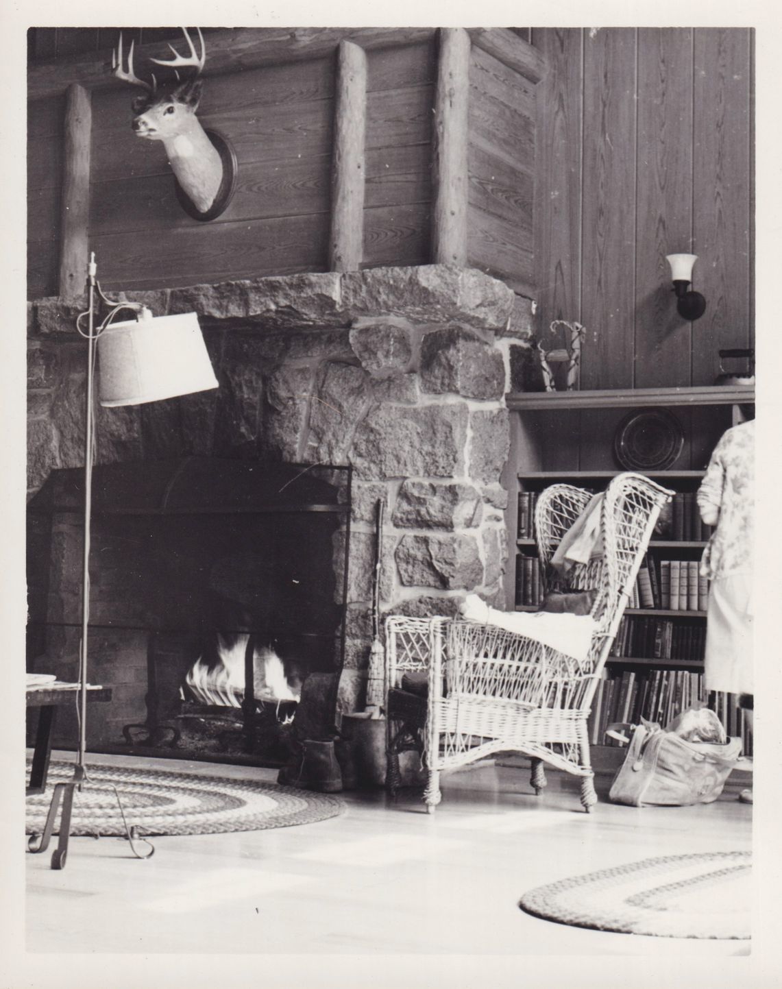 Black-and-White photograph of the interior of an unidentified cottage at Bartlett's Carry. There is a fire in the fireplace, and a deer mount hangs over the mantel.