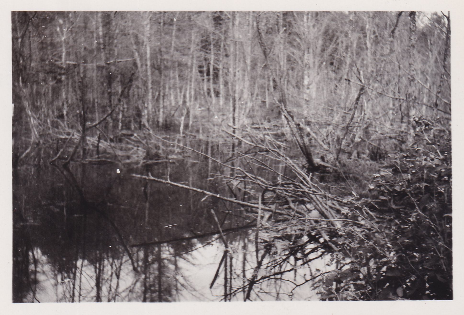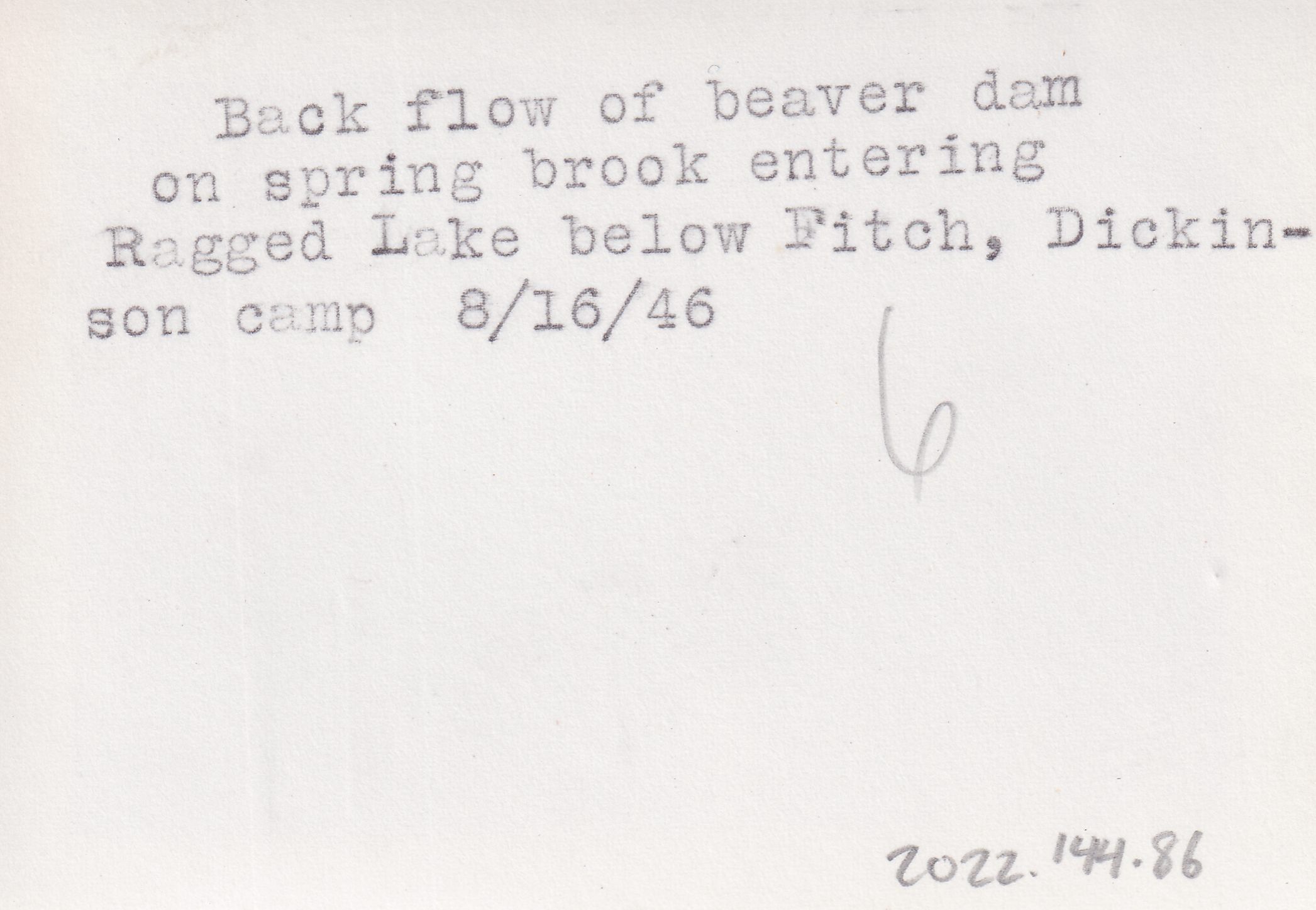 Black-and-White photograph of a beaver dam on a body of water. Typewritten caption on back reads, "Back flow of beaver dam on Spring Brook entering Ragged Lake below Fitch, Dickinson Camp. 8/16/46.