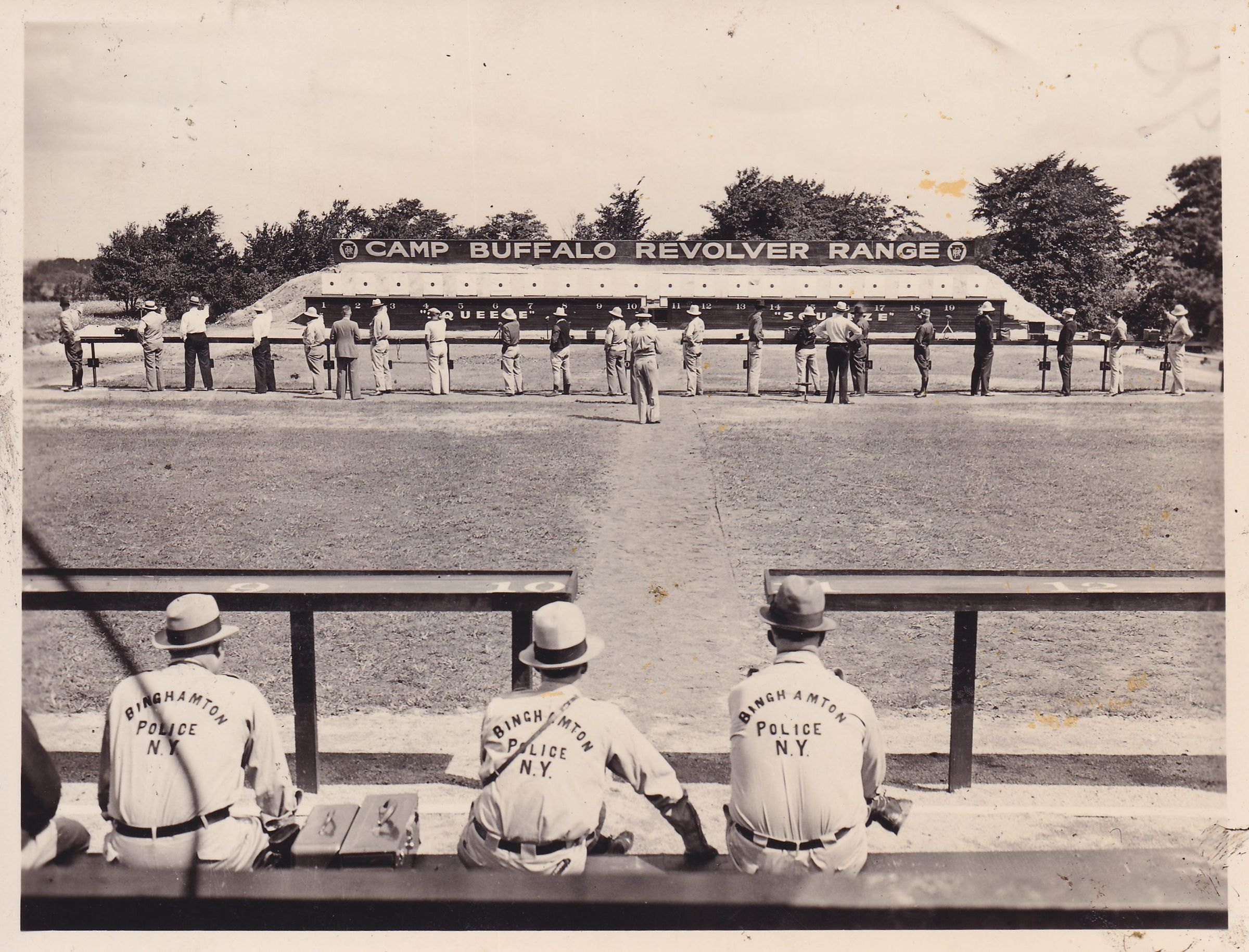Black-and-White photograph of an outdoor gun range. There are people with "Binghamton Police, N. Y." shirts seated on the bleachers, and a line of people standing at the range. Many of them are wearing game warden uniforms. Large sign above the range reads, "Camp Buffalo Revolver Range."Made/Created