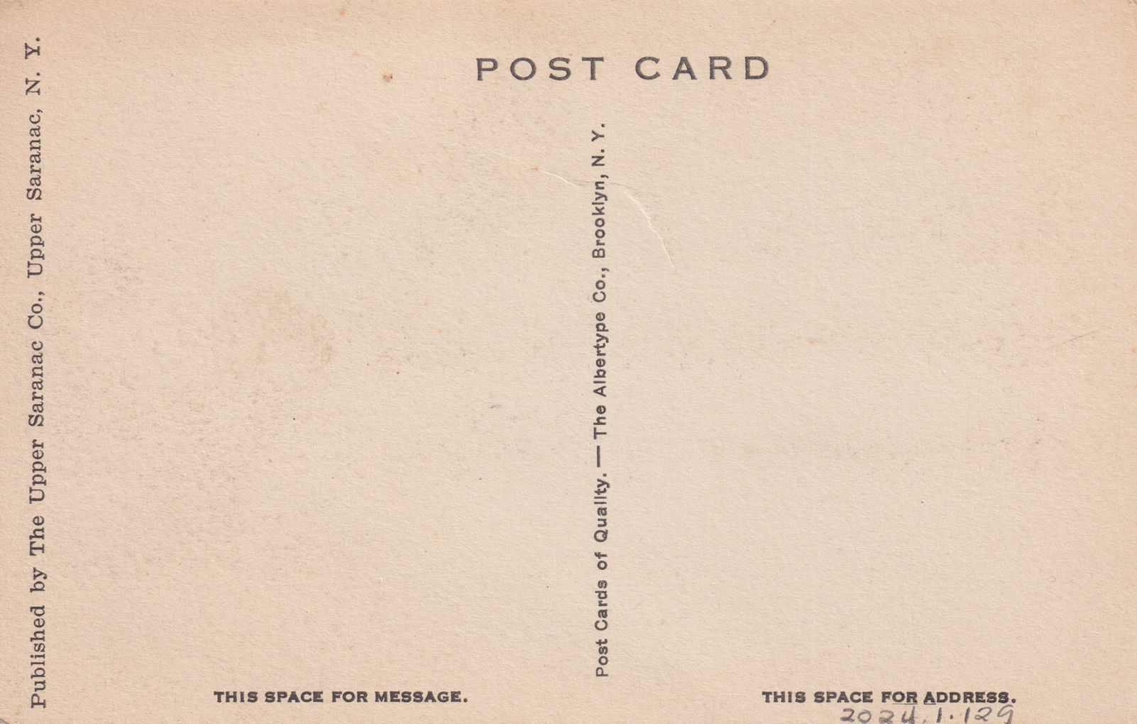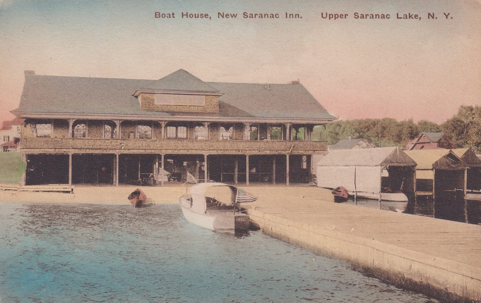 Color postcard showing the Saranac Inn Boat House from the water. A boat can be seen docked at a dock running along the right side of the image. Printed caption on front reads, "Boat House, New Saranac Inn. Upper Saranac Lake, N. Y." Printed by the Upper Saranac Co., Upper Saranac, NY and the Albertype Co., Brooklyn, NY. Unused, divided back.Subject Place