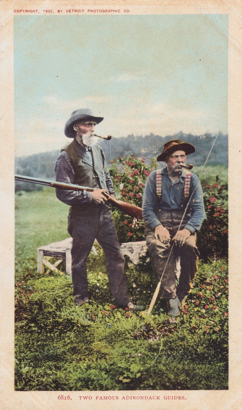 Color postcard showing two men smoking pipes outdoors. One is holding a rifle and the other a fishing rod. Printed caption on front reads, "Two Famous Adirondack Guides." Printed by Detroit Photographic Co. Used, undivided back, white border, not posted.
