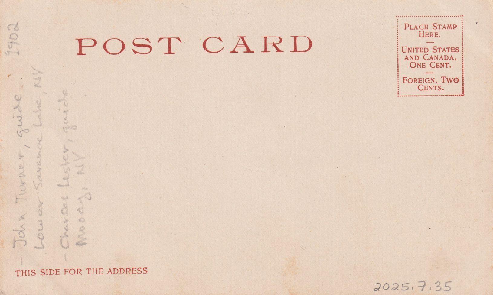 Handwritten note on reverse reads, "1902. John Turner, guide, Lower Saranac Lake, NY. Charles Lester, guide, Moody, NY."Subject Person/Organization