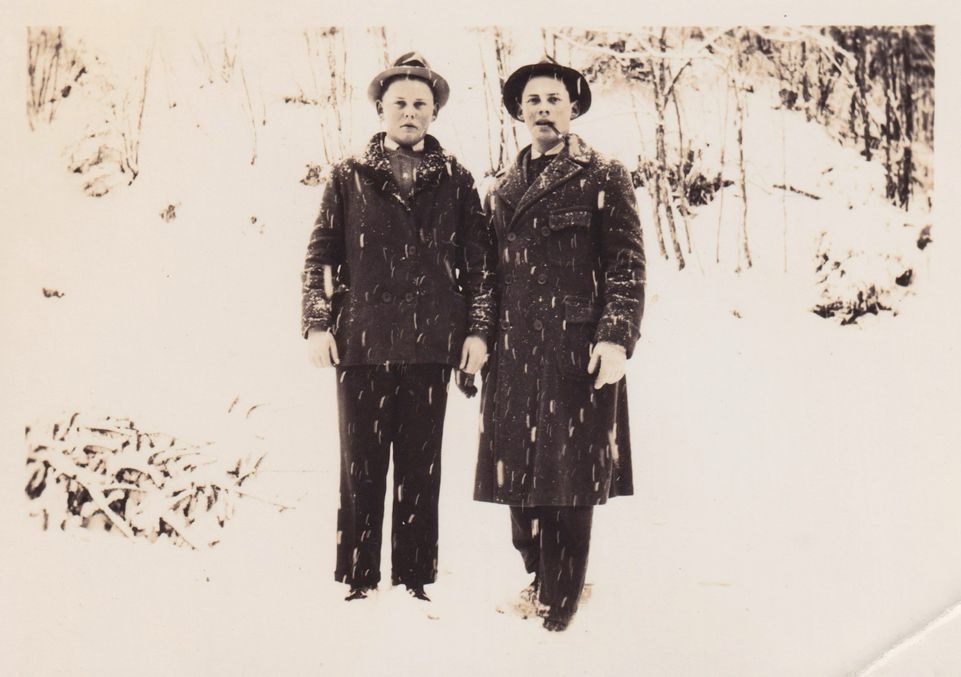 Black-and-White photograph of two young men standing in the snow. One of them has a cigar in his mouth. The photograph was likely printed by Kollecker's Kodak and Gift Shop.