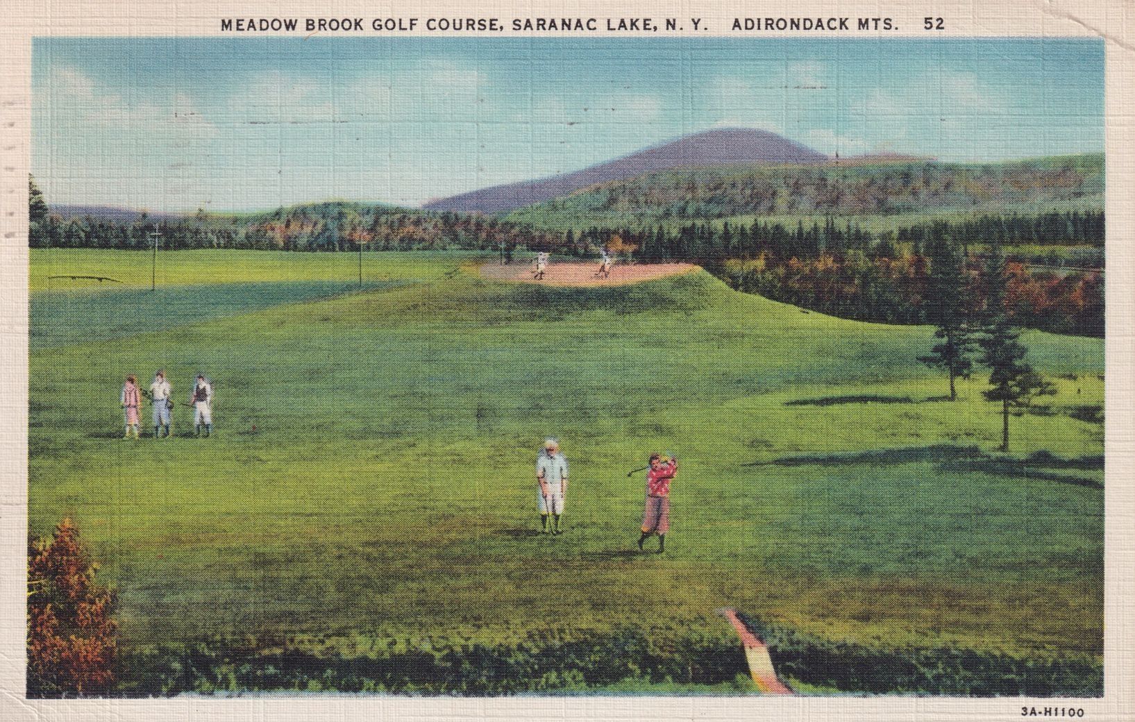 Color postcard showing players on a golf course. Printed caption on front reads, "Meadow Brook Golf Course, Saranac Lake, N. Y. Adirondack Mts." Printed by C. W. Hughes & Co., Inc. Mechanicville, NY. Used, divided back, white border, linen texture, postmarked Saranac Lake, November 25, 1940.