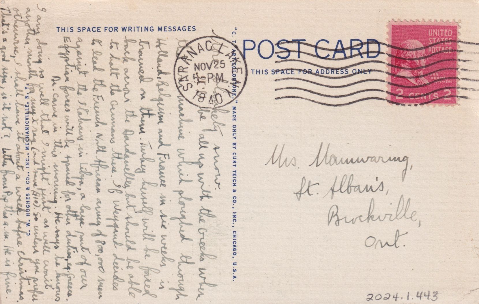 Handwritten message on reverse reads, "More blankety snow. It'll be all up with the Greeks when that war machine which ploughed through Holland, Belgium and France in six weeks is trained on them. Turkey herself will be faced back across the Dardanelles, but should be able to halt the Germans there. If Weygand decides to lead the French North African Army of 800,000 men against the [?] in Libya, a large part of our Egyptian forces will be spared for other duties, e.g. Greece. Dr. came in this morning. He says he knows that I am doing so well that I might just as well wait another month for my x ray (and save $10). So unless you prefer otherwise, I shall have it about a week before Christmas. That's a good sign, is it not? Letter from Pop this a.m. He is fine." Mailed to Mrs. Mainwaring, St. Albans, Brockville, Ont.Subject Place