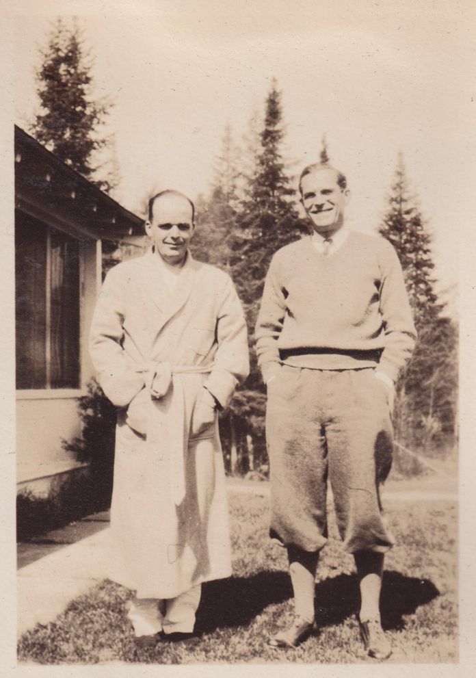 Black-and-White photograph of an unidentified man in a bathrobe standing outdoors with Blair Jones. A possible cure porch can be seen behind them. Part of album 2024.21.1, kept by Amy Jones and David Blair Jones c. 1930-1934.