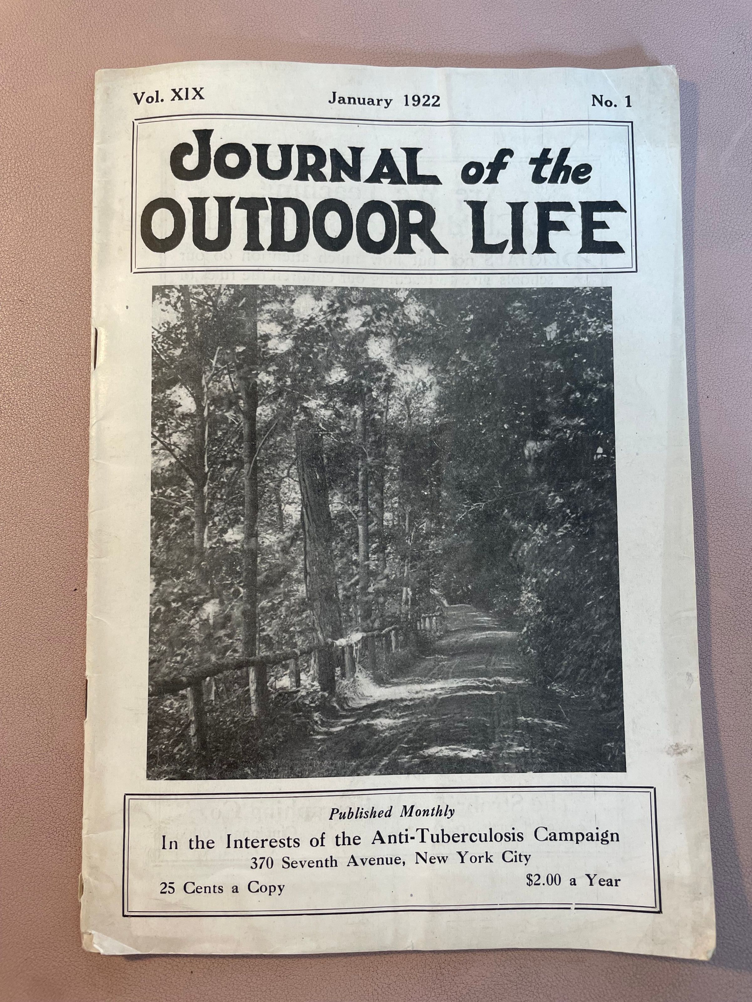 Journal of the Outdoor Life, January 1922. Includes articles on a variety of topics related to tuberculosis and its treatment. Many ads for sanatoria, cure cottages, and products for TB patients. Cover shows a photograph of a road through the woods.