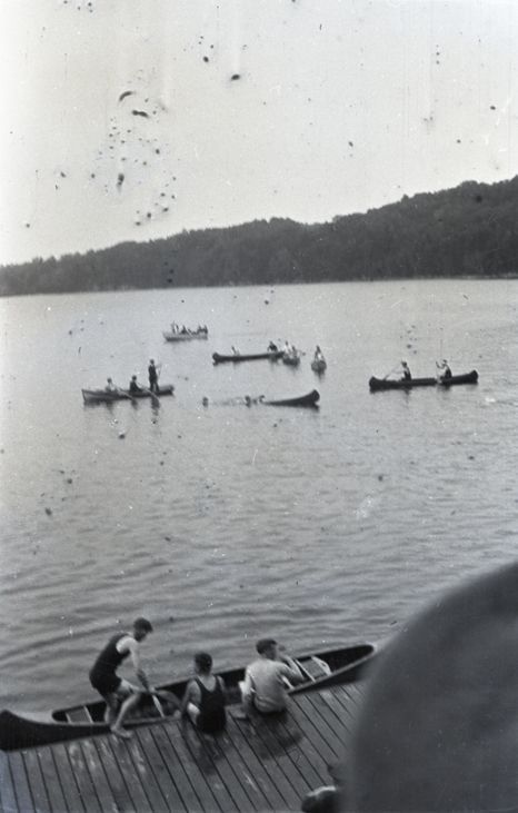 Negative of multiple canoes with young men in them out on the water. One canoe in the middle seems to be sinking. At the bottom of the negative is a dock with three young men about to get into a canoe. Most likely taken by Henry Ives Baldwin. This item is not fully cataloged but has been uploaded so the image is publicly available; if you would like us to prioritize cataloging this item, please contact the HSL Collections team.