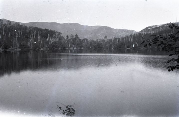 Negative of a lake view with a mountain in the background. Most likely taken by Mary Ives Baldwin. This item is not fully cataloged but has been uploaded so the image is publicly available; if you would like us to prioritize cataloging this item, please contact the HSL Collections team.