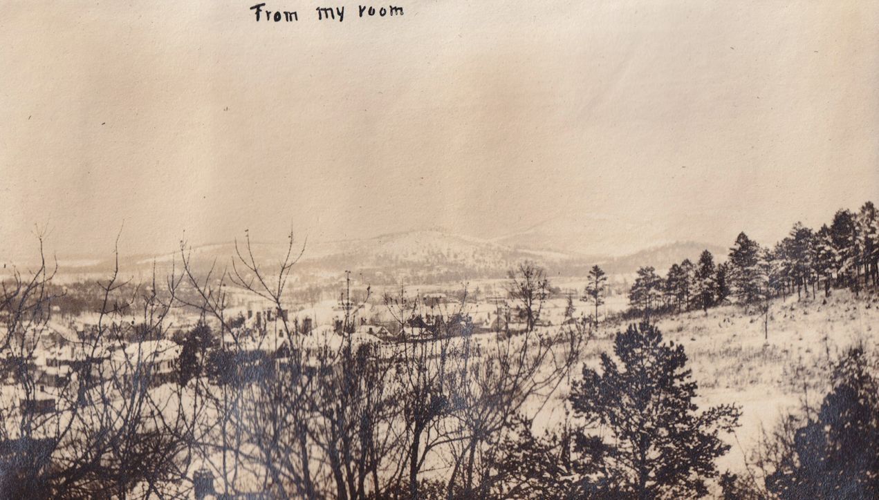 Black-and-white photograph of a snow-covered landscape with some trees and buildings in the distance. "From my room" is written in ink beneath the photograph.