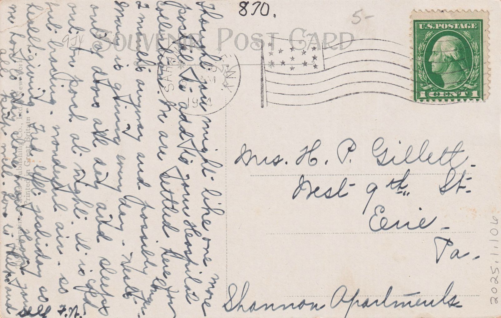 Handwritten message on reverse reads, "Thought you might like one more postal to add to your Hospital collection. We are settled here for 2 months anyway and possibly longer, Mary is gaining every day - rests out of doors all day and sleeps out on porch at night. It is cold but bracing - wonderful air - so health giving. Fred left yesterday so we have to stay alone now. Hope you all keep well. Love to [?] and all. F. N." Mailed to Mrs. H. P. Gillett, West 9th St., Erie, PA, Shannon Apartments.Subject Place