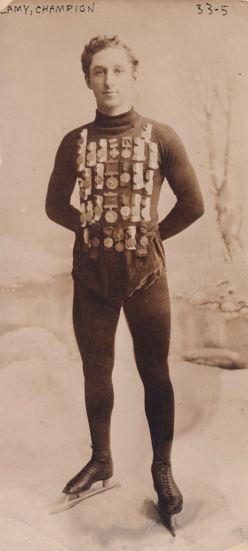 Black and white photograph of Ed Lamy in his skating uniform with all of his medals attached to the front. Handwritten at the top of the photograph is "Lamy, Champion" and "33-5."