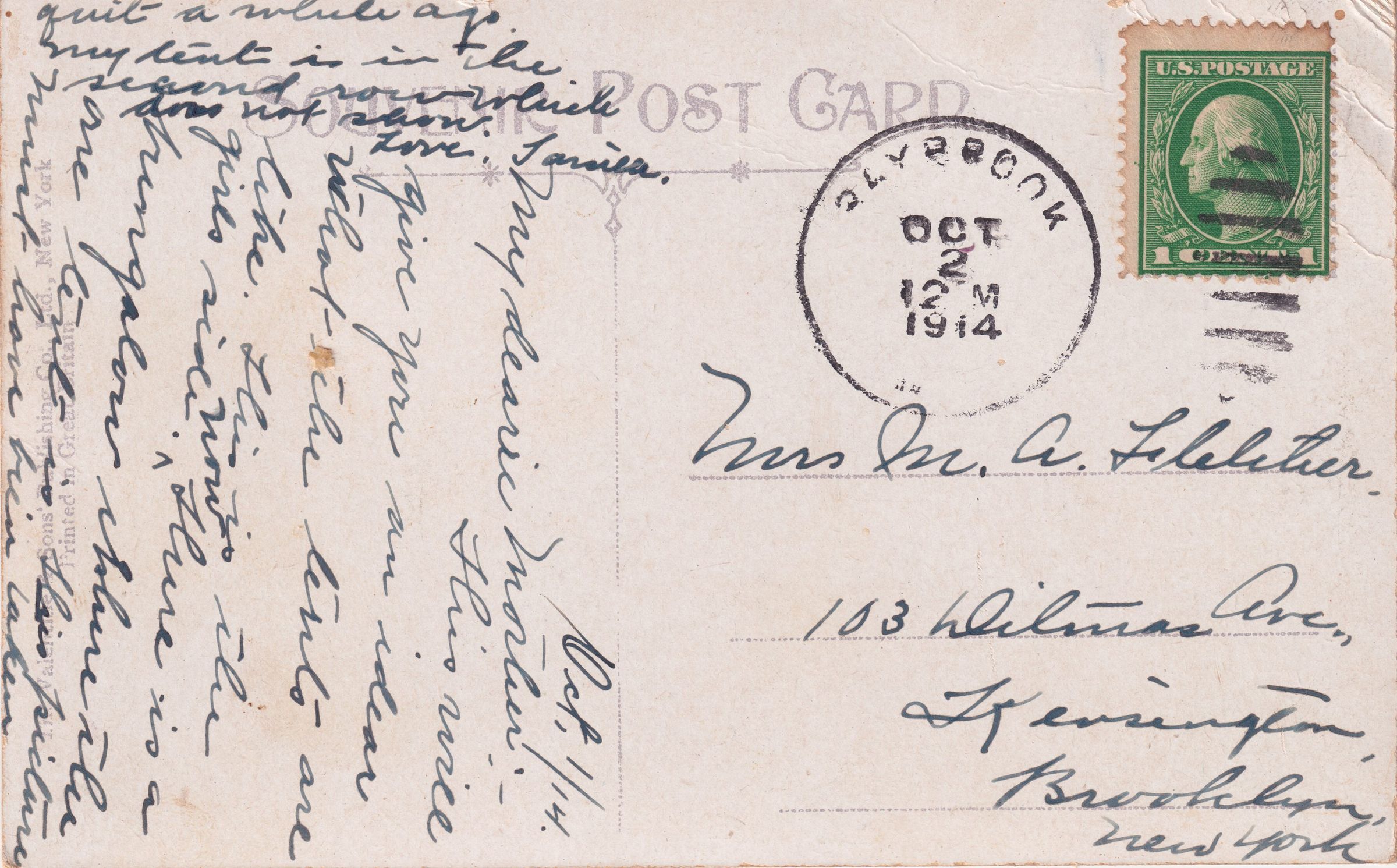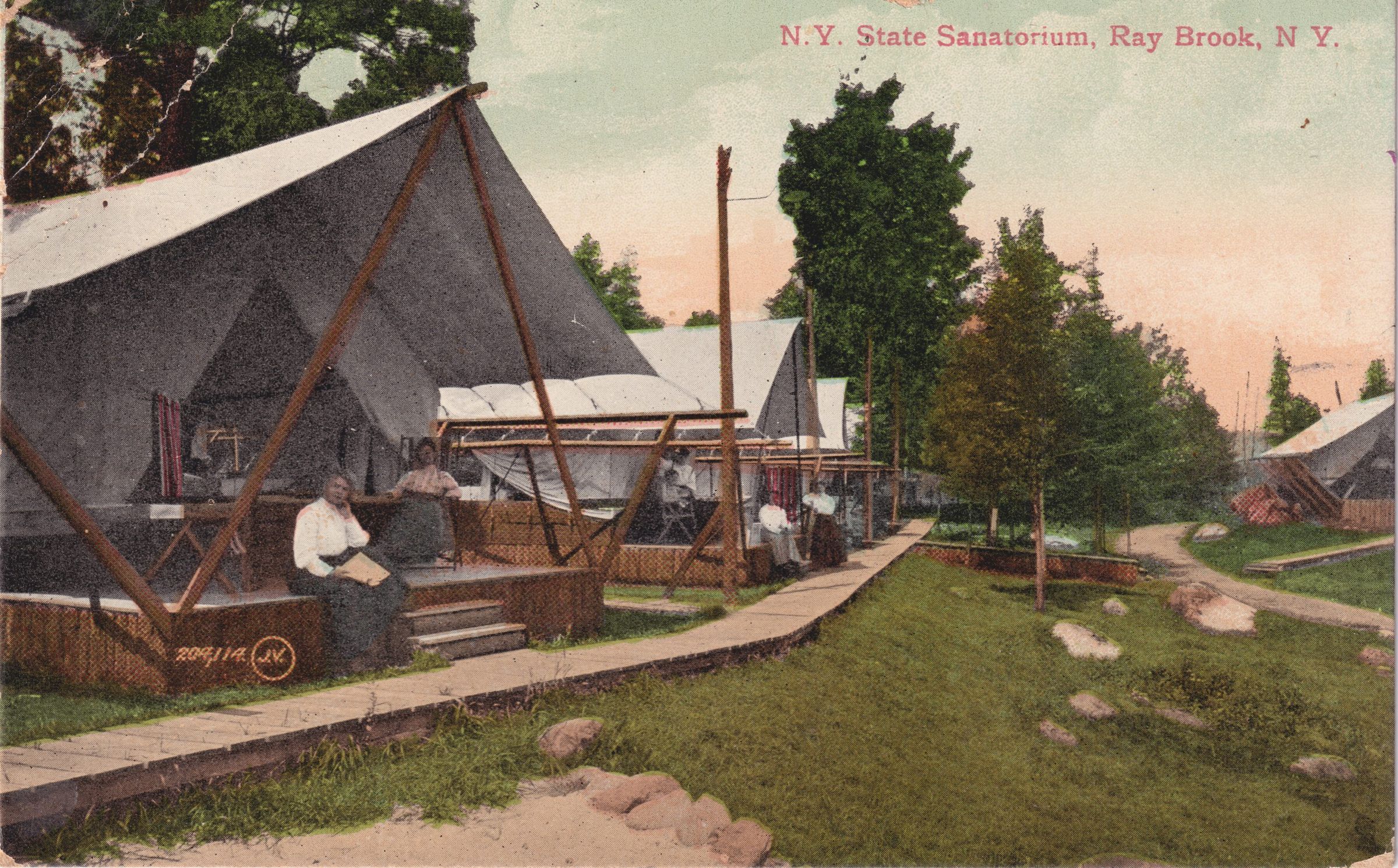 Postcard with image identified as "N.Y. State Sanatorium, Ray Brook, NY." Image shows tent platforms with unidentified patients. Message on back reads, "Oct. 1/14. My dearie Mother, This will give you an idea what the tents are like. This is the girls side now. There is a bungalow where the one tent is. This picture must have been taken quite a while ago. My tent is in the second row which does not show. Love, Tarsilla." It is addressed to "Mrs. M.A. Fletcher, 103 Ditmas Ave, Kensington, Brooklyn, New York." Postmarked in Ray Brook, NY.Collection
