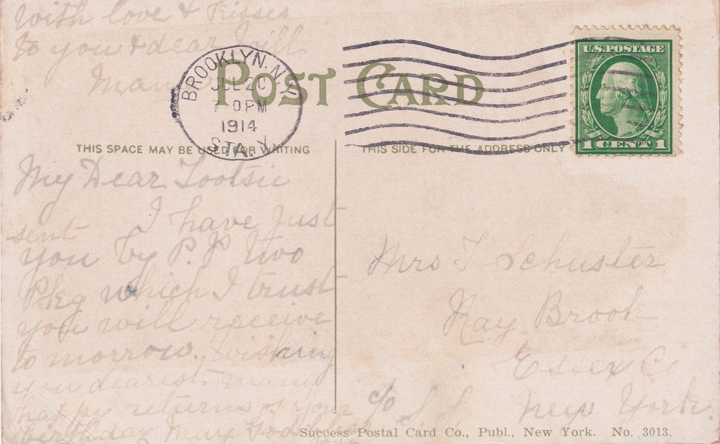 Postcard with image identified as "Old Stone Stairway, Prospect Park, Brooklyn, N.Y." Message on back reads, "My Dear Tootsie, I have just sent you by P.P. two Pkg which I trust you will receive tomorrow. Wishing you dearest many happy returns of your birthday. May God bless you with love and kisses to you and dear Will. Mama." Addressed to "Mrs. T. Schuster, Ray Brook, Essex Co. New York. c/o S.S." Postmarked in Brooklyn, NY.Collection